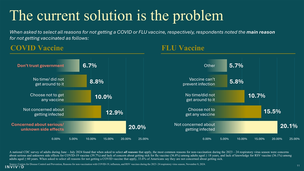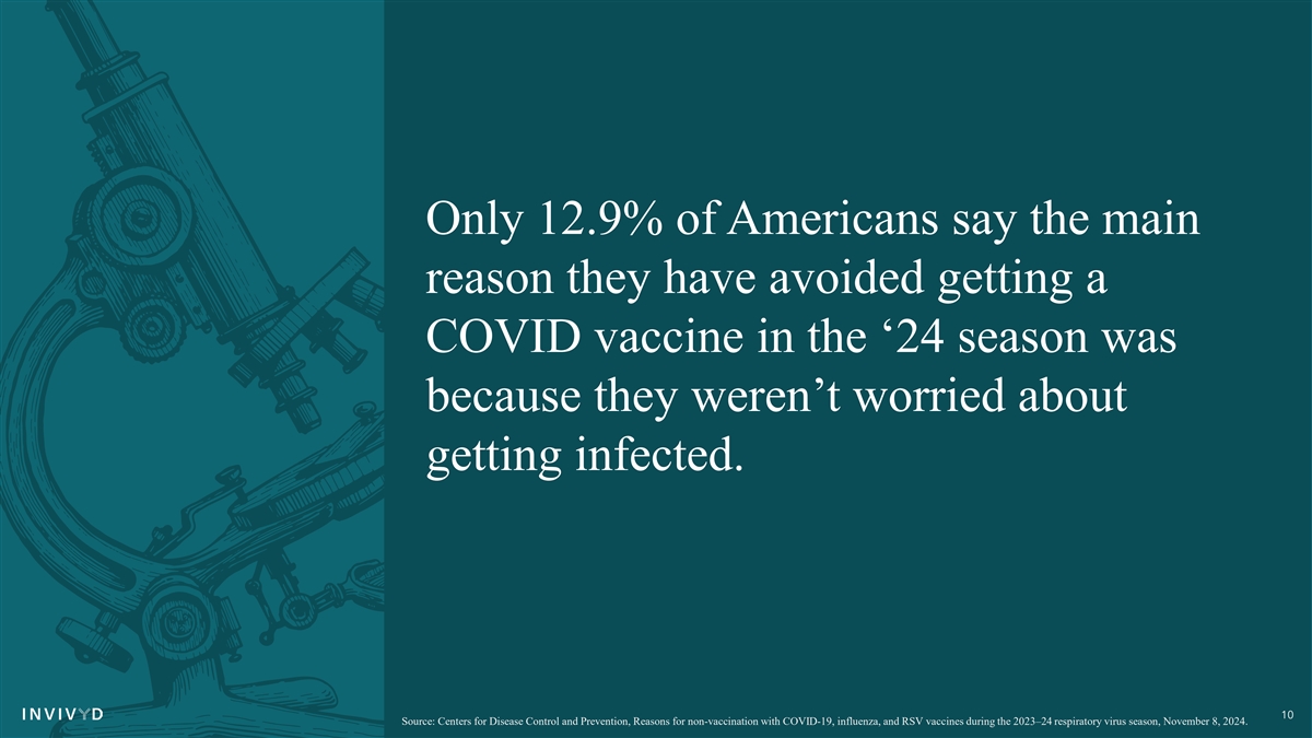 Only 12.9% of Americans say the main reason they have avoided getting a COVID vaccine in the ‘24 season was because they weren’t worried about getting infected. 10 Source: Centers for Disease Control and Prevention, Reasons for non-vaccination with COVID-19, influenza, and RSV vaccines during the 2023–24 respiratory virus season, November 8, 2024.