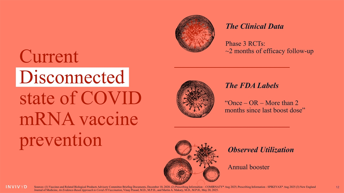 The Clinical Data Phase 3 RCTs: ~2 months of efficacy follow-up Current Disconnected The FDA Labels state of COVID “Once – OR – More than 2 months since last boost dose” mRNA vaccine prevention Observed Utilization Annual booster Sources: (1) Vaccines and Related Biological Products Advisory Committee Briefing Documents, December 10, 2020. (2) Prescribing Information – COMIRNATY® Aug 2025; Prescribing Information - SPIKEVAX® Aug 2025 (3) New England 12 Journal of Medicine, An Evidence-Based Approach to Covid-19 Vaccination, Vinay Prasad, M.D., M.P.H., and Martin A. Makary, M.D., M.P.H., May 20, 2025.