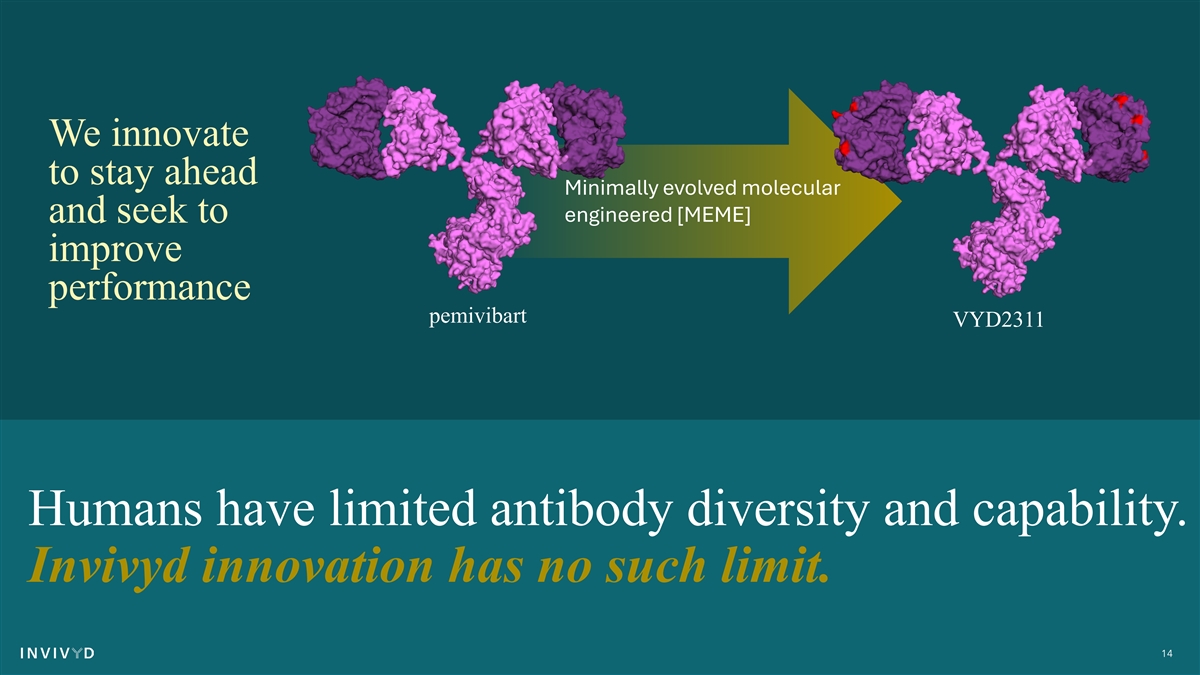 We innovate to stay ahead Minimally evolved molecular and seek to engineered [MEME] improve performance pemivibart VYD2311 Humans have limited antibody diversity and capability. Invivyd innovation has no such limit. 14