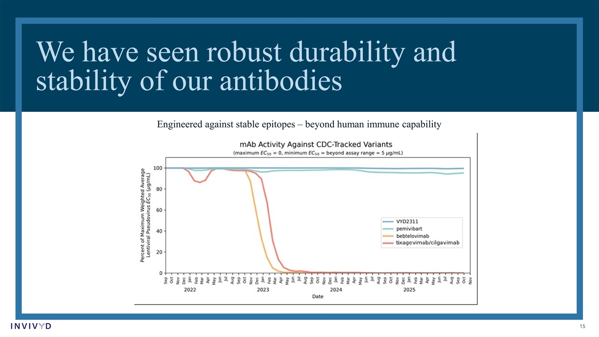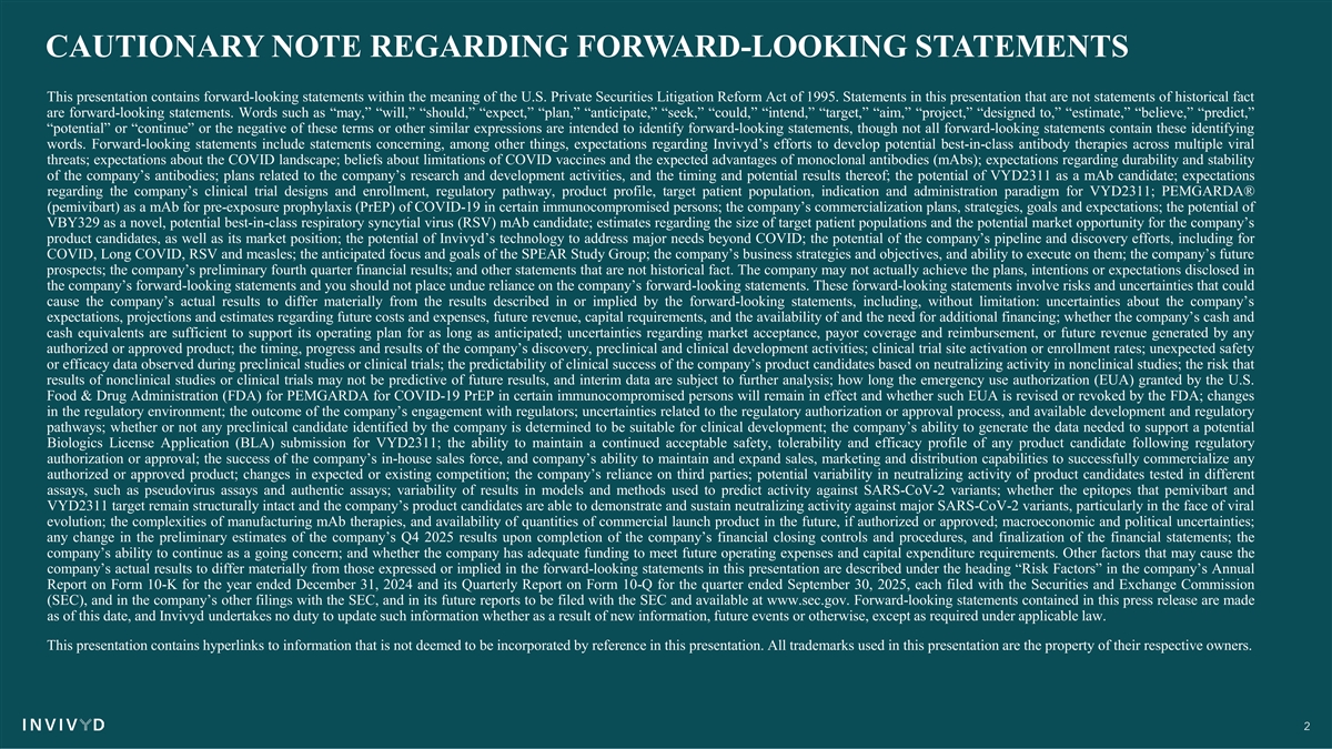 CAUTIONARY NOTE REGARDING FORWARD-LOOKING STATEMENTS This presentation contains forward-looking statements within the meaning of the U.S. Private Securities Litigation Reform Act of 1995. Statements in this presentation that are not statements of historical fact are forward-looking statements. Words such as “may,” “will,” “should,” “expect,” “plan,” “anticipate,” “seek,” “could,” “intend,” “target,” “aim,” “project,” “designed to,” “estimate,” “believe,” “predict,” “potential” or “continue” or the negative of these terms or other similar expressions are intended to identify forward-looking statements, though not all forward-looking statements contain these identifying words. Forward-looking statements include statements concerning, among other things, expectations regarding Invivyd’s efforts to develop potential best-in-class antibody therapies across multiple viral threats; expectations about the COVID landscape; beliefs about limitations of COVID vaccines and the expected advantages of monoclonal antibodies (mAbs); expectations regarding durability and stability of the company’s antibodies; plans related to the company’s research and development activities, and the timing and potential results thereof; the potential of VYD2311 as a mAb candidate; expectations regarding the company’s clinical trial designs and enrollment, regulatory pathway, product profile, target patient population, indication and administration paradigm for VYD2311; PEMGARDA® (pemivibart) as a mAb for pre-exposure prophylaxis (PrEP) of COVID-19 in certain immunocompromised persons; the company’s commercialization plans, strategies, goals and expectations; the potential of VBY329 as a novel, potential best-in-class respiratory syncytial virus (RSV) mAb candidate; estimates regarding the size of target patient populations and the potential market opportunity for the company’s product candidates, as well as its market position; the potential of Invivyd’s technology to address major needs beyond COVID; the potential of the company’s pipeline and discovery efforts, including for COVID, Long COVID, RSV and measles; the anticipated focus and goals of the SPEAR Study Group; the company’s business strategies and objectives, and ability to execute on them; the company’s future prospects; the company’s preliminary fourth quarter financial results; and other statements that are not historical fact. The company may not actually achieve the plans, intentions or expectations disclosed in the company’s forward-looking statements and you should not place undue reliance on the company’s forward-looking statements. These forward-looking statements involve risks and uncertainties that could cause the company’s actual results to differ materially from the results described in or implied by the forward-looking statements, including, without limitation: uncertainties about the company’s expectations, projections and estimates regarding future costs and expenses, future revenue, capital requirements, and the availability of and the need for additional financing; whether the company’s cash and cash equivalents are sufficient to support its operating plan for as long as anticipated; uncertainties regarding market acceptance, payor coverage and reimbursement, or future revenue generated by any authorized or approved product; the timing, progress and results of the company’s discovery, preclinical and clinical development activities; clinical trial site activation or enrollment rates; unexpected safety or efficacy data observed during preclinical studies or clinical trials; the predictability of clinical success of the company’s product candidates based on neutralizing activity in nonclinical studies; the risk that results of nonclinical studies or clinical trials may not be predictive of future results, and interim data are subject to further analysis; how long the emergency use authorization (EUA) granted by the U.S. Food & Drug Administration (FDA) for PEMGARDA for COVID-19 PrEP in certain immunocompromised persons will remain in effect and whether such EUA is revised or revoked by the FDA; changes in the regulatory environment; the outcome of the company’s engagement with regulators; uncertainties related to the regulatory authorization or approval process, and available development and regulatory pathways; whether or not any preclinical candidate identified by the company is determined to be suitable for clinical development; the company’s ability to generate the data needed to support a potential Biologics License Application (BLA) submission for VYD2311; the ability to maintain a continued acceptable safety, tolerability and efficacy profile of any product candidate following regulatory authorization or approval; the success of the company’s in-house sales force, and company’s ability to maintain and expand sales, marketing and distribution capabilities to successfully commercialize any authorized or approved product; changes in expected or existing competition; the company’s reliance on third parties; potential variability in neutralizing activity of product candidates tested in different assays, such as pseudovirus assays and authentic assays; variability of results in models and methods used to predict activity against SARS-CoV-2 variants; whether the epitopes that pemivibart and VYD2311 target remain structurally intact and the company’s product candidates are able to demonstrate and sustain neutralizing activity against major SARS-CoV-2 variants, particularly in the face of viral evolution; the complexities of manufacturing mAb therapies, and availability of quantities of commercial launch product in the future, if authorized or approved; macroeconomic and political uncertainties; any change in the preliminary estimates of the company’s Q4 2025 results upon completion of the company’s financial closing control