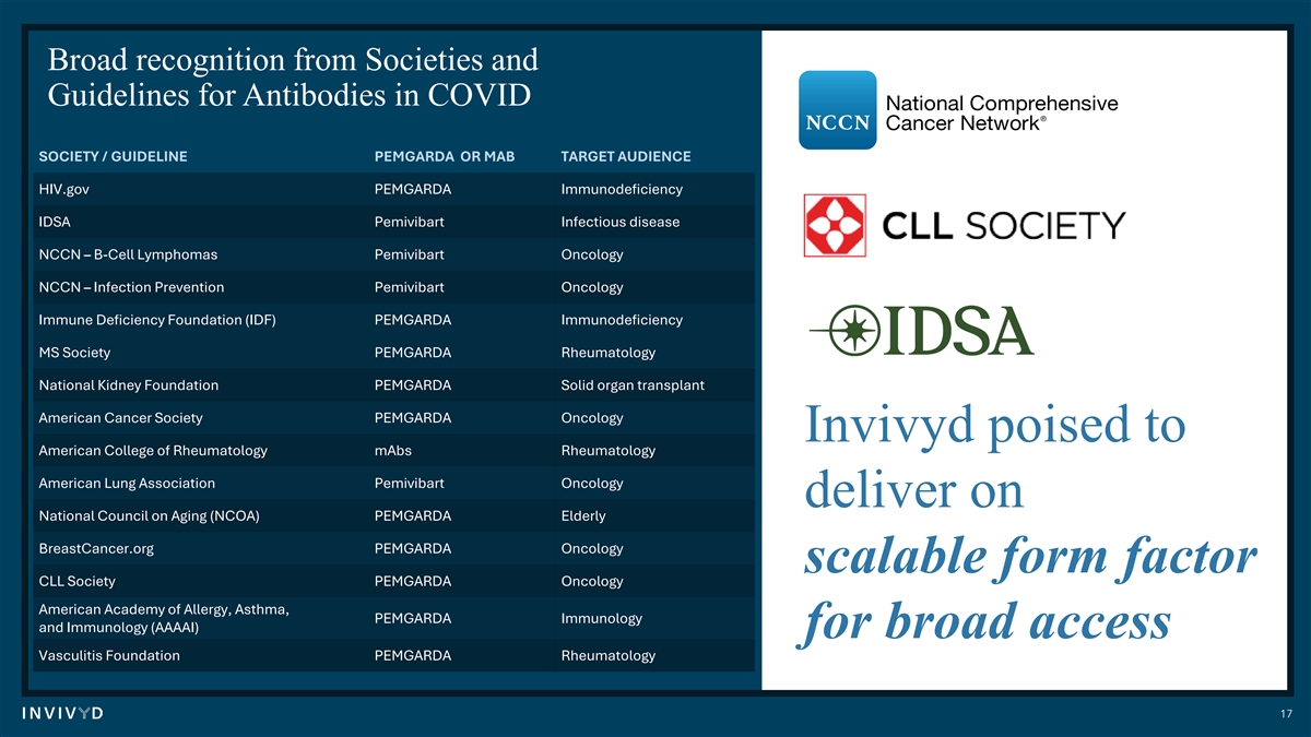 Broad recognition from Societies and Guidelines for Antibodies in COVID SOCIETY / GUIDELINE PEMGARDA OR MAB TARGET AUDIENCE HIV.gov PEMGARDA Immunodeficiency IDSA Pemivibart Infectious disease NCCN – B-Cell Lymphomas Pemivibart Oncology NCCN – Infection Prevention Pemivibart Oncology Immune Deficiency Foundation (IDF) PEMGARDA Immunodeficiency MS Society PEMGARDA Rheumatology National Kidney Foundation PEMGARDA Solid organ transplant American Cancer Society PEMGARDA Oncology Invivyd poised to American College of Rheumatology mAbs Rheumatology American Lung Association Pemivibart Oncology deliver on National Council on Aging (NCOA) PEMGARDA Elderly BreastCancer.org PEMGARDA Oncology scalable form factor CLL Society PEMGARDA Oncology American Academy of Allergy, Asthma, PEMGARDA Immunology and Immunology (AAAAI) for broad access Vasculitis Foundation PEMGARDA Rheumatology 17