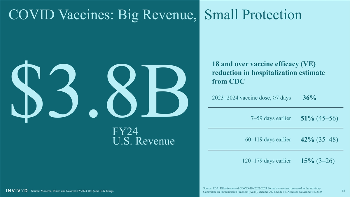 COVID Vaccines: Big Revenue, Small Protection 18 and over vaccine efficacy (VE) reduction in hospitalization estimate from CDC 2023–2024 vaccine dose, ≥7 days 36% $3.8B 7–59 days earlier 51% (45–56) FY24 60–119 days earlier 42% (35–48) U.S. Revenue 120–179 days earlier 15% (3–26) Source: FDA. Effectiveness of COVID-19 (2023-2024 Formula) vaccines, presented to the Advisory Source: Moderna, Pfizer, and Novavax FY2024 10-Q and 10-K filings. 18 Committee on Immunization Practices (ACIP), October 2024. Slide 16. Accessed November 16, 2025