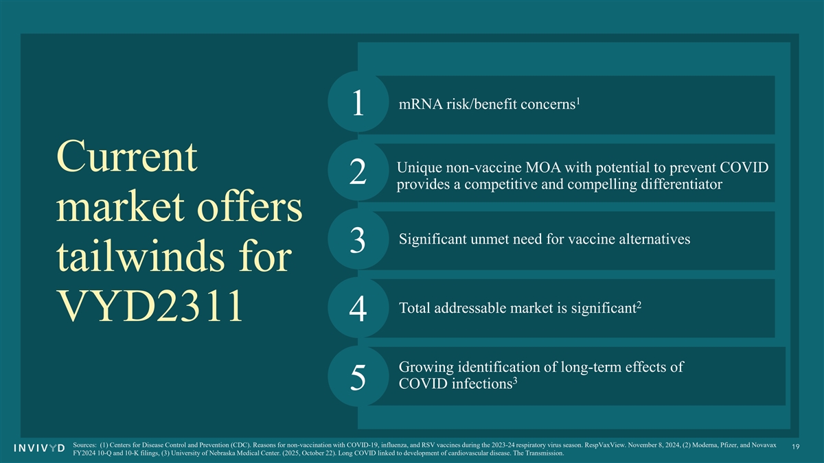 1 mRNA risk/benefit concerns 1 Current Unique non-vaccine MOA with potential to prevent COVID 2 provides a competitive and compelling differentiator market offers Significant unmet need for vaccine alternatives 3 tailwinds for 2 Total addressable market is significant VYD2311 4 Growing identification of long-term effects of 3 COVID infections 5 Sources: (1) Centers for Disease Control and Prevention (CDC). Reasons for non-vaccination with COVID-19, influenza, and RSV vaccines during the 2023-24 respiratory virus season. RespVaxView. November 8, 2024, (2) Moderna, Pfizer, and Novavax 19 FY2024 10-Q and 10-K filings, (3) University of Nebraska Medical Center. (2025, October 22). Long COVID linked to development of cardiovascular disease. The Transmission.