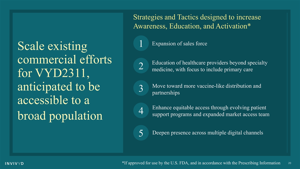 Strategies and Tactics designed to increase Awareness, Education, and Activation* Expansion of sales force 1 Scale existing commercial efforts Education of healthcare providers beyond specialty 2 medicine, with focus to include primary care for VYD2311, Move toward more vaccine-like distribution and anticipated to be 3 partnerships accessible to a Enhance equitable access through evolving patient 4 support programs and expanded market access team broad population Deepen presence across multiple digital channels 5 20 *If approved for use by the U.S. FDA, and in accordance with the Prescribing Information