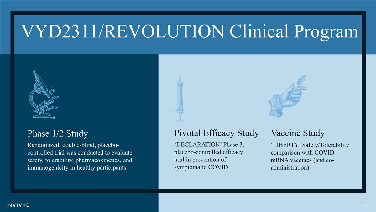 VYD2311/REVOLUTION Clinical Program Pivotal Efficacy Study Vaccine Study Phase 1/2 Study ‘DECLARATION’ Phase 3, Randomized, double-blind, placebo- ‘LIBERTY’ Safety/Tolerability placebo-controlled efficacy controlled trial was conducted to evaluate comparison with COVID trial in prevention of safety, tolerability, pharmacokinetics, and mRNA vaccines (and co- symptomatic COVID immunogenicity in healthy participants administration) 21