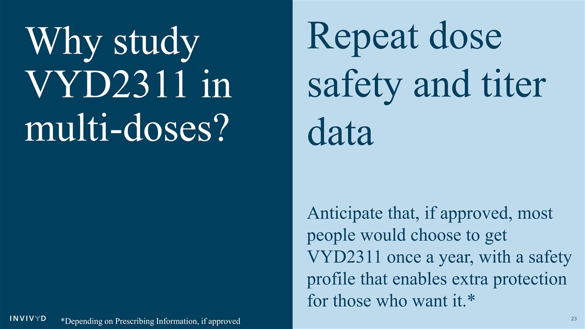 Repeat dose Why study safety and titer VYD2311 in multi-doses? data Anticipate that, if approved, most people would choose to get VYD2311 once a year, with a safety profile that enables extra protection for those who want it.* 23 *Depending on Prescribing Information, if approved