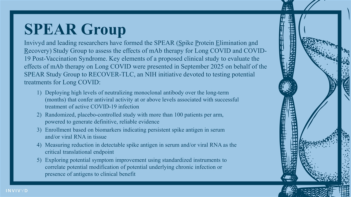 SPEAR Group Invivyd and leading researchers have formed the SPEAR (Spike Protein Elimination and Recovery) Study Group to assess the effects of mAb therapy for Long COVID and COVID- 19 Post-Vaccination Syndrome. Key elements of a proposed clinical study to evaluate the effects of mAb therapy on Long COVID were presented in September 2025 on behalf of the SPEAR Study Group to RECOVER-TLC, an NIH initiative devoted to testing potential treatments for Long COVID: 1) Deploying high levels of neutralizing monoclonal antibody over the long-term (months) that confer antiviral activity at or above levels associated with successful treatment of active COVID-19 infection 2) Randomized, placebo-controlled study with more than 100 patients per arm, powered to generate definitive, reliable evidence 3) Enrollment based on biomarkers indicating persistent spike antigen in serum and/or viral RNA in tissue 4) Measuring reduction in detectable spike antigen in serum and/or viral RNA as the critical translational endpoint 5) Exploring potential symptom improvement using standardized instruments to correlate potential modification of potential underlying chronic infection or presence of antigens to clinical benefit 26
