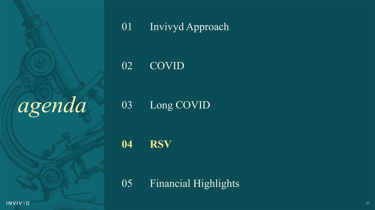 01 Invivyd Approach 02 COVID 03 Long COVID agenda 04 RSV 05 Financial Highlights 27