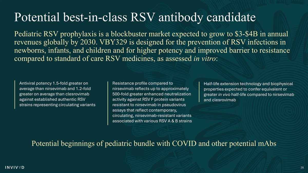 Potential best-in-class RSV antibody candidate Pediatric RSV prophylaxis is a blockbuster market expected to grow to $3-$4B in annual revenues globally by 2030. VBY329 is designed for the prevention of RSV infections in newborns, infants, and children and for higher potency and improved barrier to resistance compared to standard of care RSV medicines, as assessed in vitro: Antiviral potency 1.5-fold greater on Resistance profile compared to Half-life extension technology and biophysical average than nirsevimab and 1.2-fold nirsevimab reflects up to approximately properties expected to confer equivalent or greater on average than clesrovimab 500-fold greater enhanced neutralization greater in vivo half-life compared to nirsevimab against established authentic RSV activity against RSV F protein variants and clesrovimab strains representing circulating variants resistant to nirsevimab in pseudovirus assays that reflect contemporary, circulating, nirsevimab-resistant variants associated with various RSV A & B strains Potential beginnings of pediatric bundle with COVID and other potential mAbs 28