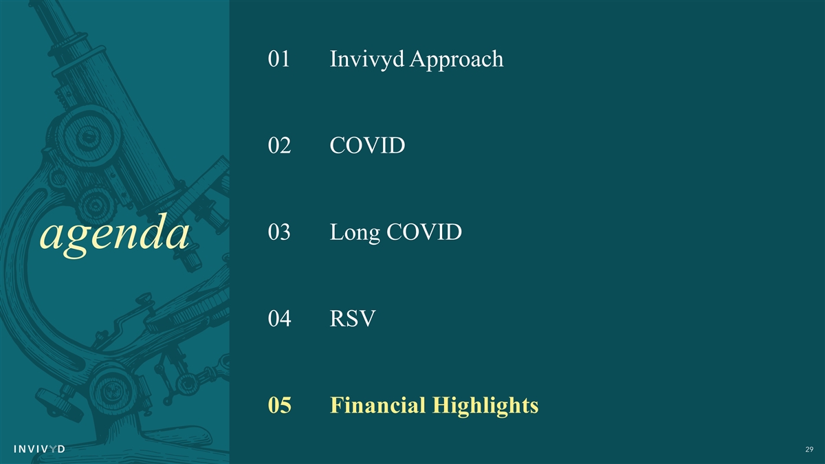 01 Invivyd Approach 02 COVID 03 Long COVID agenda 04 RSV 05 Financial Highlights 29
