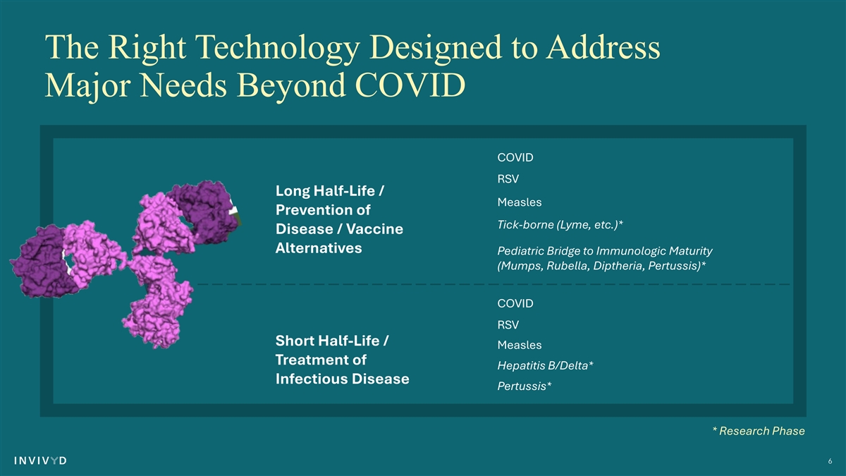The Right Technology Designed to Address Major Needs Beyond COVID COVID RSV Long Half-Life / Measles Prevention of Tick-borne (Lyme, etc.)* Disease / Vaccine Alternatives Pediatric Bridge to Immunologic Maturity (Mumps, Rubella, Diptheria, Pertussis)* COVID RSV Short Half-Life / Measles Treatment of Hepatitis B/Delta* Infectious Disease Pertussis* * Research Phase 6