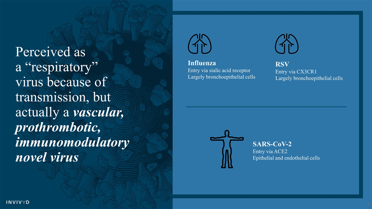 Perceived as Influenza RSV a “respiratory” Entry via sialic acid receptor Entry via CX3CR1 Largely bronchoepithelial cells Largely bronchoepithelial cells virus because of transmission, but actually a vascular, prothrombotic, SARS-CoV-2 immunomodulatory Entry via ACE2 Epithelial and endothelial cells novel virus 8
