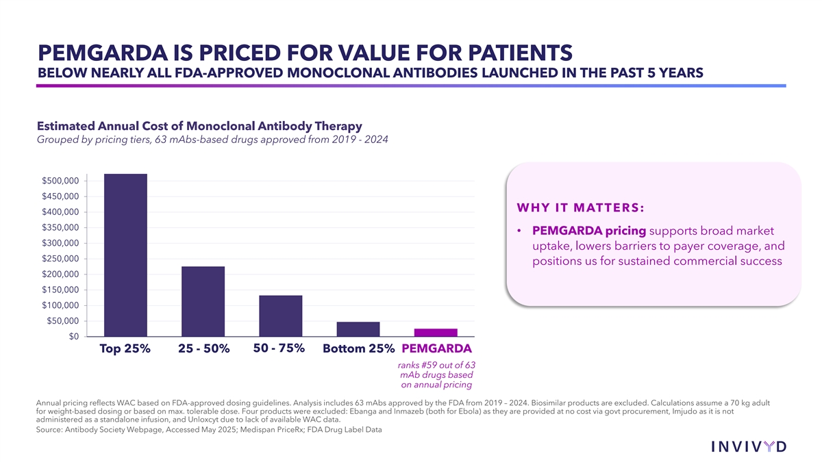 PEMGARDA IS PRICED FOR VALUE FOR PATIENTS BELOW NEARLY ALL FDA-APPROVED MONOCLONAL ANTIBODIES LAUNCHED IN THE PAST 5 YEARS Estimated Annual Cost of Monoclonal Antibody Therapy Grouped by pricing tiers, 63 mAbs-based drugs approved from 2019 - 2024 $500,000 $450,000 WHY IT MATTERS: $400,000 $350,000 • PEMGARDA pricing supports broad market $300,000 uptake, lowers barriers to payer coverage, and $250,000 positions us for sustained commercial success $200,000 $150,000 $100,000 $50,000 $0 Top 25% 25 - 50% 50 - 75% Bottom 25% PEMGARDA ranks #59 out of 63 mAb drugs based on annual pricing Annual pricing reflects WAC based on FDA-approved dosing guidelines. Analysis includes 63 mAbs approved by the FDA from 2019 – 2024. Biosimilar products are excluded. Calculations assume a 70 kg adult for weight-based dosing or based on max. tolerable dose. Four products were excluded: Ebanga and Inmazeb (both for Ebola) as they are provided at no cost via govt procurement, Imjudo as it is not administered as a standalone infusion, and Unloxcyt due to lack of available WAC data. Source: Antibody Society Webpage, Accessed May 2025; Medispan PriceRx; FDA Drug Label Data