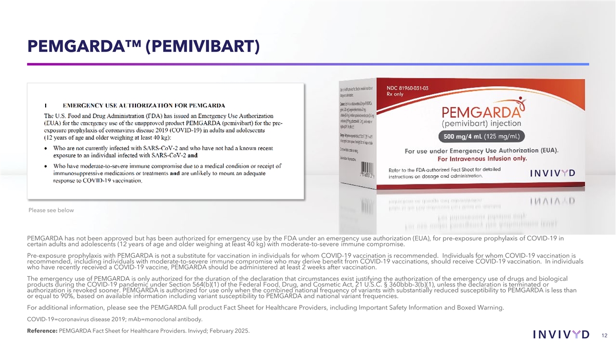 PEMGARDA (PEMIVIBART) Please see below PEMGARDA has not been approved but has been authorized for emergency use by the FDA under an emergency use authorization (EUA), for pre-exposure prophylaxis of COVID-19 in certain adults and adolescents (12 years of age and older weighing at least 40 kg) with moderate-to-severe immune compromise. Pre-exposure prophylaxis with PEMGARDA is not a substitute for vaccination in individuals for whom COVID-19 vaccination is recommended. Individuals for whom COVID-19 vaccination is recommended, including individuals with moderate-to-severe immune compromise who may derive benefit from COVID-19 vaccinations, should receive COVID-19 vaccination. In individuals who have recently received a COVID-19 vaccine, PEMGARDA should be administered at least 2 weeks after vaccination. The emergency use of PEMGARDA is only authorized for the duration of the declaration that circumstances exist justifying the authorization of the emergency use of drugs and biological products during the COVID-19 pandemic under Section 564(b)(1) of the Federal Food, Drug, and Cosmetic Act, 21 U.S.C. § 360bbb-3(b)(1), unless the declaration is terminated or authorization is revoked sooner. PEMGARDA is authorized for use only when the combined national frequency of variants with substantially reduced susceptibility to PEMGARDA is less than or equal to 90%, based on available information including variant susceptibility to PEMGARDA and national variant frequencies. For additional information, please see the PEMGARDA full product Fact Sheet for Healthcare Providers, including Important Safety Information and Boxed Warning. COVID-19=coronavirus disease 2019; mAb=monoclonal antibody. Reference: PEMGARDA Fact Sheet for Healthcare Providers. Invivyd; February 2025. 12