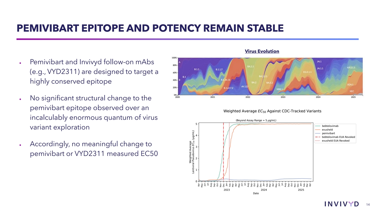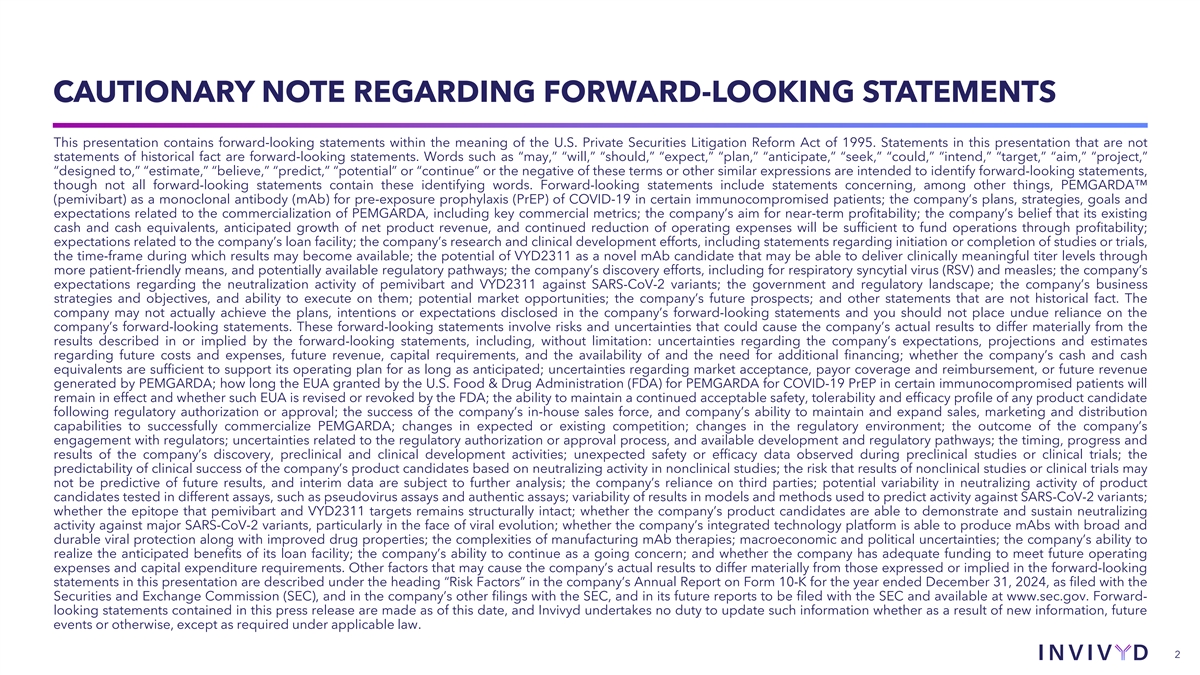 CAUTIONARY NOTE REGARDING FORWARD-LOOKING STATEMENTS This presentation contains forward-looking statements within the meaning of the U.S. Private Securities Litigation Reform Act of 1995. Statements in this presentation that are not statements of historical fact are forward-looking statements. Words such as “may,” “will,” “should,” “expect,” “plan,” “anticipate,” “seek,” “could,” “intend,” “target,” “aim,” “project,” “designed to,” “estimate,” “believe,” “predict,” “potential” or “continue” or the negative of these terms or other similar expressions are intended to identify forward-looking statements, though not all forward-looking statements contain these identifying words. Forward-looking statements include statements concerning, among other things, PEMGARDA (pemivibart) as a monoclonal antibody (mAb) for pre-exposure prophylaxis (PrEP) of COVID-19 in certain immunocompromised patients; the company’s plans, strategies, goals and expectations related to the commercialization of PEMGARDA, including key commercial metrics; the company’s aim for near-term profitability; the company’s belief that its existing cash and cash equivalents, anticipated growth of net product revenue, and continued reduction of operating expenses will be sufficient to fund operations through profitability; expectations related to the company’s loan facility; the company’s research and clinical development efforts, including statements regarding initiation or completion of studies or trials, the time-frame during which results may become available; the potential of VYD2311 as a novel mAb candidate that may be able to deliver clinically meaningful titer levels through more patient-friendly means, and potentially available regulatory pathways; the company’s discovery efforts, including for respiratory syncytial virus (RSV) and measles; the company’s expectations regarding the neutralization activity of pemivibart and VYD2311 against SARS-CoV-2 variants; the government and regulatory landscape; the company’s business strategies and objectives, and ability to execute on them; potential market opportunities; the company’s future prospects; and other statements that are not historical fact. The company may not actually achieve the plans, intentions or expectations disclosed in the company’s forward-looking statements and you should not place undue reliance on the company’s forward-looking statements. These forward-looking statements involve risks and uncertainties that could cause the company’s actual results to differ materially from the results described in or implied by the forward-looking statements, including, without limitation: uncertainties regarding the company’s expectations, projections and estimates regarding future costs and expenses, future revenue, capital requirements, and the availability of and the need for additional financing; whether the company’s cash and cash equivalents are sufficient to support its operating plan for as long as anticipated; uncertainties regarding market acceptance, payor coverage and reimbursement, or future revenue generated by PEMGARDA; how long the EUA granted by the U.S. Food & Drug Administration (FDA) for PEMGARDA for COVID-19 PrEP in certain immunocompromised patients will remain in effect and whether such EUA is revised or revoked by the FDA; the ability to maintain a continued acceptable safety, tolerability and efficacy profile of any product candidate following regulatory authorization or approval; the success of the company’s in-house sales force, and company’s ability to maintain and expand sales, marketing and distribution capabilities to successfully commercialize PEMGARDA; changes in expected or existing competition; changes in the regulatory environment; the outcome of the company’s engagement with regulators; uncertainties related to the regulatory authorization or approval process, and available development and regulatory pathways; the timing, progress and results of the company’s discovery, preclinical and clinical development activities; unexpected safety or efficacy data observed during preclinical studies or clinical trials; the predictability of clinical success of the company’s product candidates based on neutralizing activity in nonclinical studies; the risk that results of nonclinical studies or clinical trials may not be predictive of future results, and interim data are subject to further analysis; the company’s reliance on third parties; potential variability in neutralizing activity of product candidates tested in different assays, such as pseudovirus assays and authentic assays; variability of results in models and methods used to predict activity against SARS-CoV-2 variants; whether the epitope that pemivibart and VYD2311 targets remains structurally intact; whether the company’s product candidates are able to demonstrate and sustain neutralizing activity against major SARS-CoV-2 variants, particularly in the face of viral evolution; whether the company’s integrated technology platform is able to produce mAbs with broad and durable viral protection along with improved drug properties; the complexities of manufacturing mAb therapies; macroeconomic and political uncertainties; the company’s ability to realize the anticipated benefits of its loan facility; the company’s ability to continue as a going concern; and whether the company has adequate funding to meet future operating expenses and capital expenditure requirements. Other factors that may cause the company’s actual results to differ materially from those expressed or implied in the forward-looking statements in this presentation are described under the heading “Risk Factors” in the company’s Annual Report on Form 10-K for the year ended December 31, 2024, as filed with the Securities and Exchange Commission (SEC), and in the company’s other filings with the SEC, a