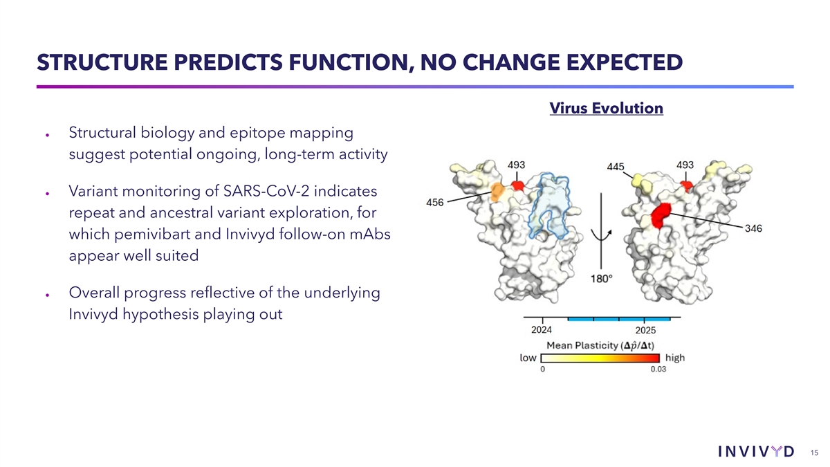PEMIVIBART EPITOPE AND POTENCY REMAIN STABLE Virus Evolution • Pemivibart and Invivyd follow-on mAbs (e.g., VYD2311) are designed to target a highly conserved epitope • No significant structural change to the pemivibart epitope observed over an incalculably enormous quantum of virus variant exploration • Accordingly, no meaningful change to pemivibart or VYD2311 measured EC50 14