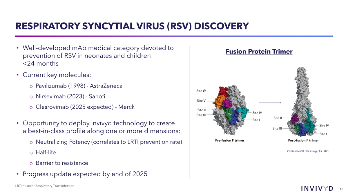 RESPIRATORY SYNCYTIAL VIRUS (RSV) DISCOVERY • Well-developed mAb medical category devoted to Fusion Protein Trimer prevention of RSV in neonates and children <24 months • Current key molecules: o Pavilizumab (1998) - AstraZeneca o Nirsevimab (2023) - Sanofi o Clesrovimab (2025 expected) - Merck • Opportunity to deploy Invivyd technology to create a best-in-class profile along one or more dimensions: o Neutralizing Potency (correlates to LRTI prevention rate) Pantaleo Nat Rev Drug Dis 2022 o Half-life o Barrier to resistance • Progress update expected by end of 2025 LRTI = Lower Respiratory Tract Infection 16
