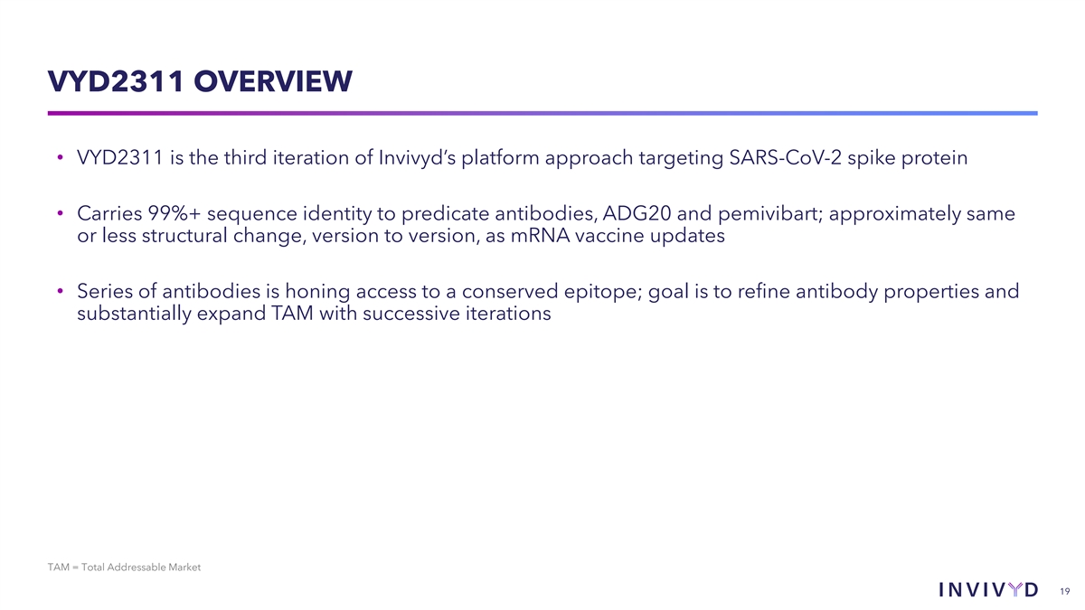 VYD2311 OVERVIEW • VYD2311 is the third iteration of Invivyd’s platform approach targeting SARS-CoV-2 spike protein • Carries 99%+ sequence identity to predicate antibodies, ADG20 and pemivibart; approximately same or less structural change, version to version, as mRNA vaccine updates • Series of antibodies is honing access to a conserved epitope; goal is to refine antibody properties and substantially expand TAM with successive iterations TAM = Total Addressable Market 19