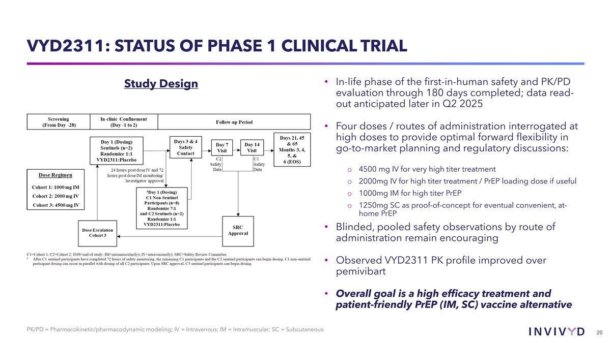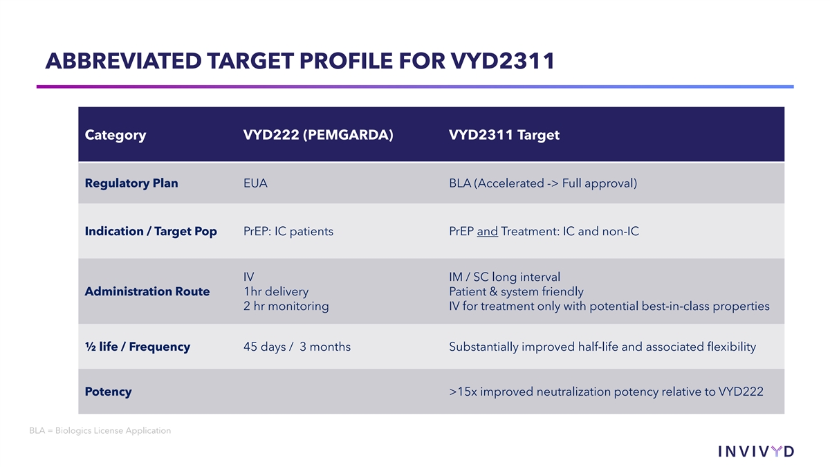 ABBREVIATED TARGET PROFILE FOR VYD2311 Category VYD222 (PEMGARDA) VYD2311 Target Regulatory Plan EUA BLA (Accelerated -> Full approval) Indication / Target Pop PrEP: IC patients PrEP and Treatment: IC and non-IC IV IM / SC long interval Administration Route 1hr delivery Patient & system friendly 2 hr monitoring IV for treatment only with potential best-in-class properties ½ life / Frequency 45 days / 3 months Substantially improved half-life and associated flexibility Potency >15x improved neutralization potency relative to VYD222 BLA = Biologics License Application