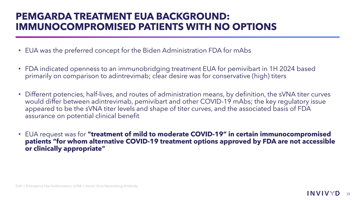 | | In February 2025, the U.S. Food and Drug Administration (FDA) declined Invivyds request to expand the existing EUA of PEMGARDA to include treatment of mild-to-moderate COVID-19 for certain immunocompromised patients who have no alternative therapeutic options. The FDA declination letter provides reasoning that may provide a near-term pathway for VYD2311. |