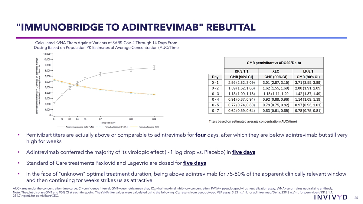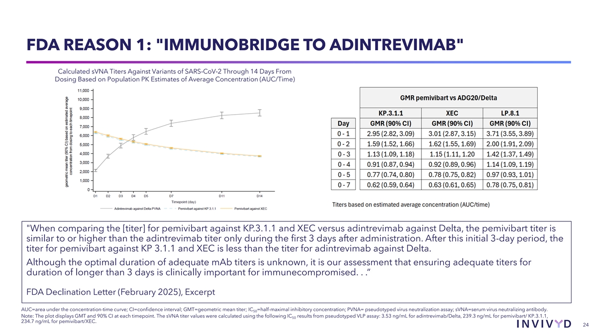 FDA REASON 1: IMMUNOBRIDGE TO ADINTREVIMAB Calculated sVNA Titers Against Variants of SARS-CoV-2 Through 14 Days From Dosing Based on Population PK Estimates of Average Concentration (AUC/Time) When comparing the [titer] for pemivibart against KP.3.1.1 and XEC versus adintrevimab against Delta, the pemivibart titer is similar to or higher than the adintrevimab titer only during the first 3 days after administration. After this initial 3-day period, the titer for pemivibart against KP 3.1.1 and XEC is less than the titer for adintrevimab against Delta. Although the optimal duration of adequate mAb titers is unknown, it is our assessment that ensuring adequate titers for duration of longer than 3 days is clinically important for immunecompromised. . .“ FDA Declination Letter (February 2025), Excerpt AUC=area under the concentration-time curve; CI=confidence interval; GMT=geometric mean titer; IC =half-maximal inhibitory concentration; PVNA= pseudotyped virus neutralization assay; sVNA=serum virus neutralizing antibody. 50 Note: The plot displays GMT and 90% CI at each timepoint. The sVNA titer values were calculated using the following IC results from pseudotyped VLP assay: 3.53 ng/mL for adintrevimab/Delta, 239.3 ng/mL for pemivibart/ KP.3.1.1, 50 234.7 ng/mL for pemivibart/XEC. 24
