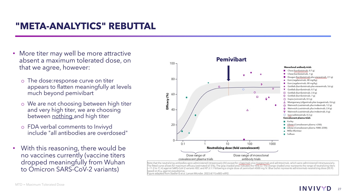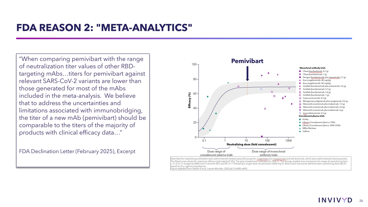 FDA REASON 2: META-ANALYTICS “When comparing pemivibart with the range Pemivibart of neutralization titer values of other RBD- targeting mAbs…titers for pemivibart against relevant SARS-CoV-2 variants are lower than those generated for most of the mAbs included in the meta-analysis. We believe that to address the uncertainties and limitations associated with immunobridging, the titer of a new mAb (pemivibart) should be comparable to the titers of the majority of products with clinical efficacy data…” FDA Declination Letter (February 2025), Excerpt 26