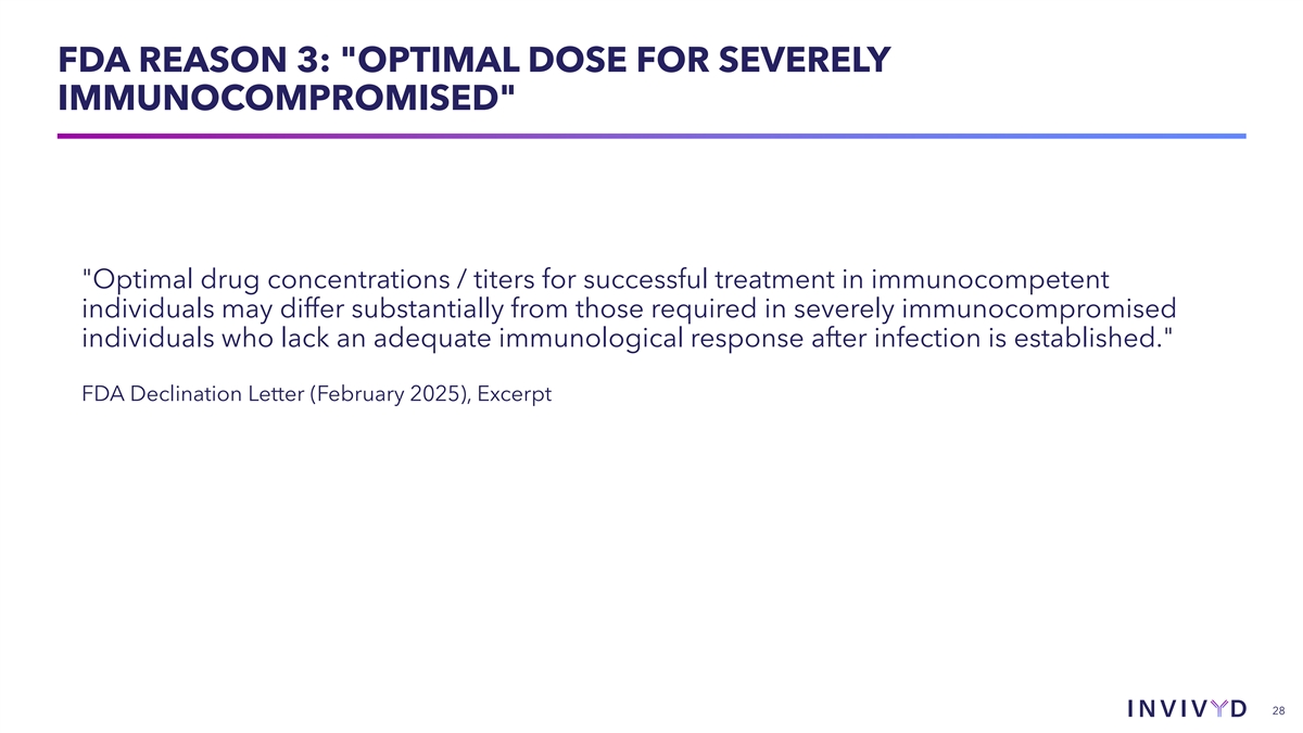 FDA REASON 3: OPTIMAL DOSE FOR SEVERELY IMMUNOCOMPROMISED Optimal drug concentrations / titers for successful treatment in immunocompetent individuals may differ substantially from those required in severely immunocompromised individuals who lack an adequate immunological response after infection is established. FDA Declination Letter (February 2025), Excerpt 28