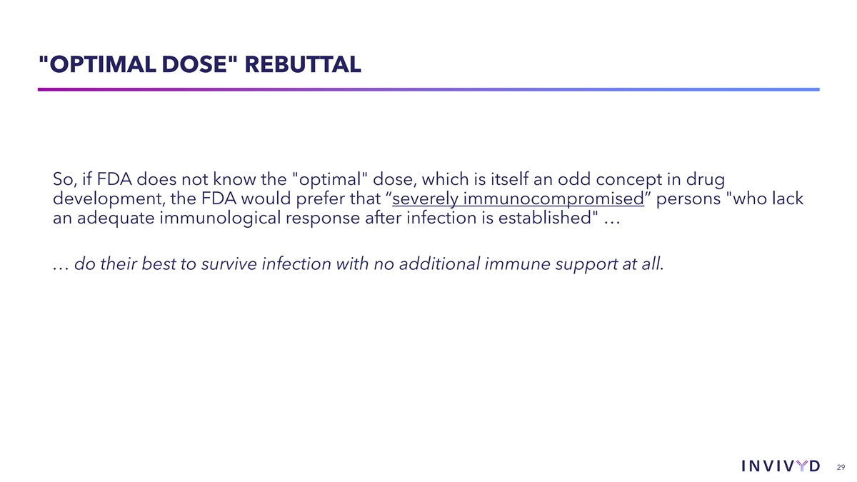 OPTIMAL DOSE REBUTTAL So, if FDA does not know the optimal dose, which is itself an odd concept in drug development, the FDA would prefer that “severely immunocompromised” persons who lack an adequate immunological response after infection is established … … do their best to survive infection with no additional immune support at all. 29