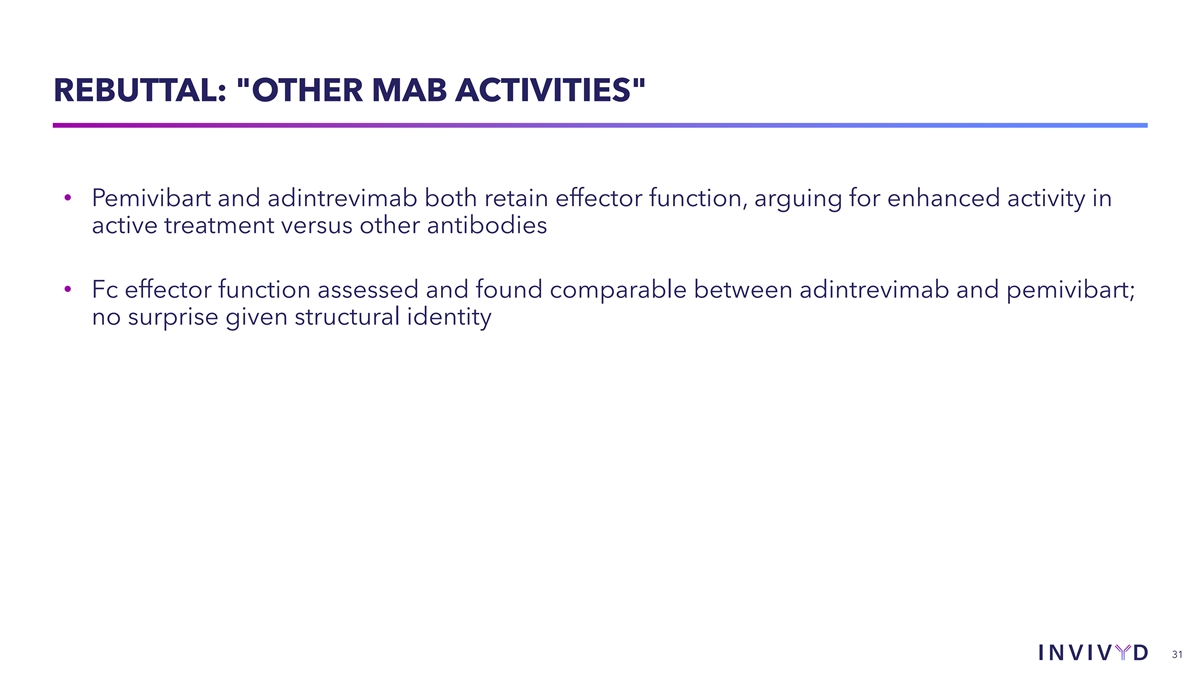 REBUTTAL: OTHER MAB ACTIVITIES • Pemivibart and adintrevimab both retain effector function, arguing for enhanced activity in active treatment versus other antibodies • Fc effector function assessed and found comparable between adintrevimab and pemivibart; no surprise given structural identity 31