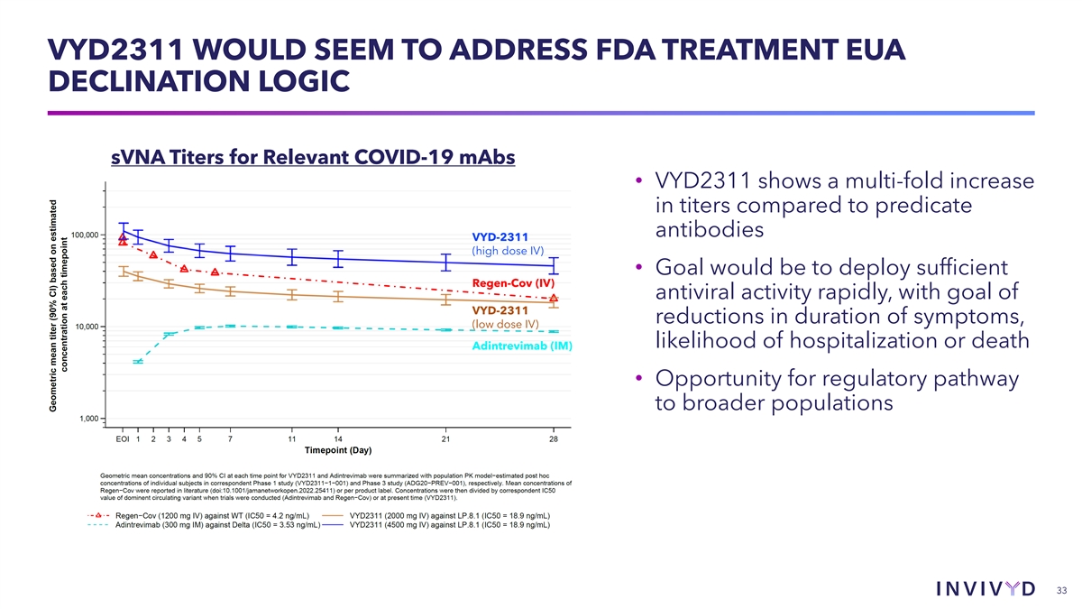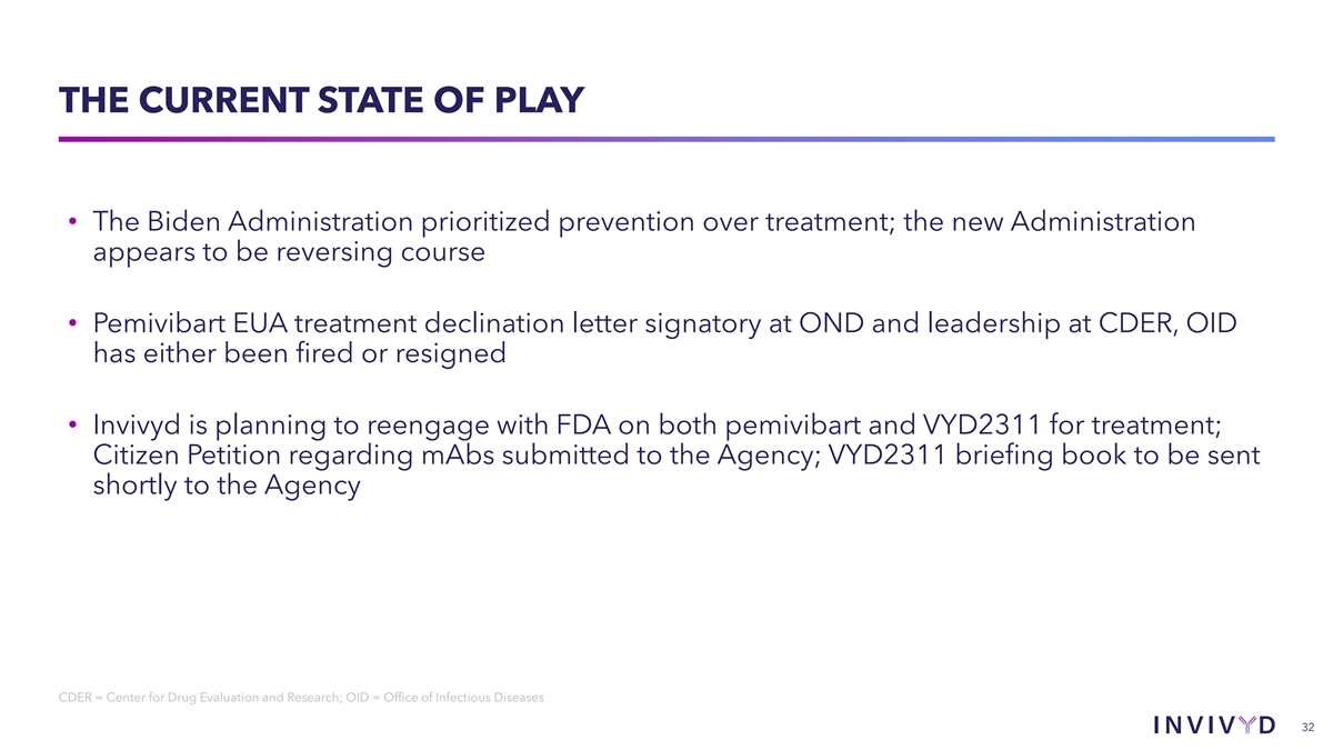 THE CURRENT STATE OF PLAY • The Biden Administration prioritized prevention over treatment; the new Administration appears to be reversing course • Pemivibart EUA treatment declination letter signatory at OND and leadership at CDER, OID has either been fired or resigned • Invivyd is planning to reengage with FDA on both pemivibart and VYD2311 for treatment; Citizen Petition regarding mAbs submitted to the Agency; VYD2311 briefing book to be sent shortly to the Agency CDER = Center for Drug Evaluation and Research; OID = Office of Infectious Diseases 32