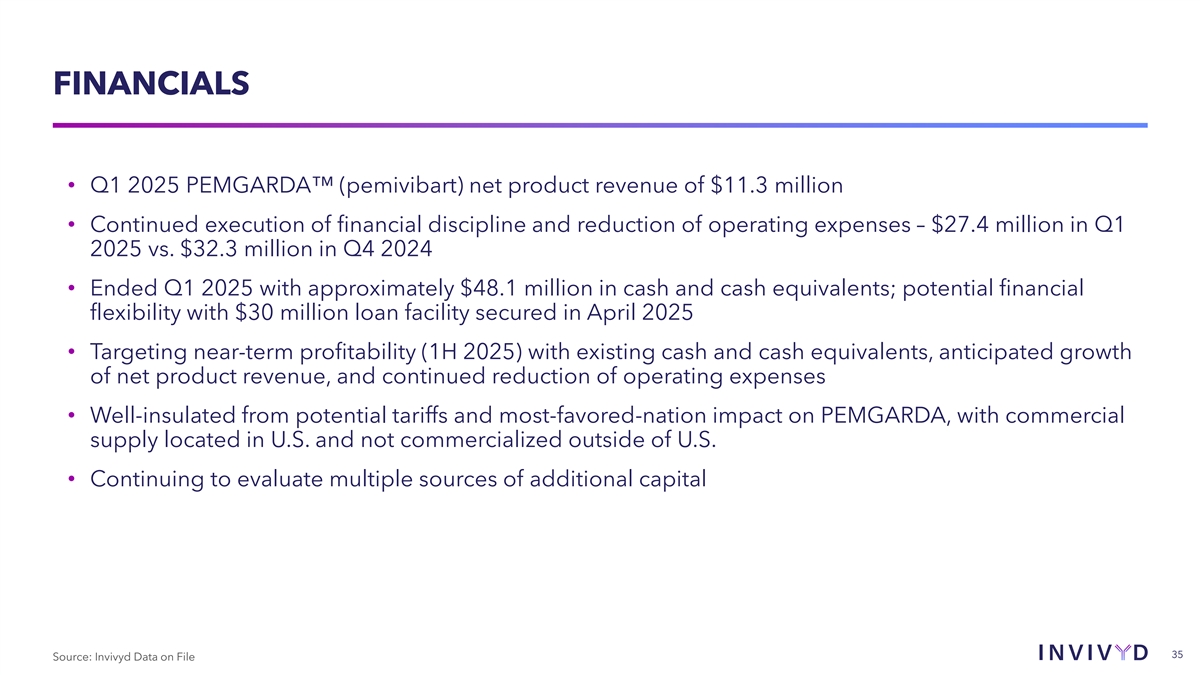| | Revenue: Reported Q1 2025 PEMGARDA net product revenue of $11.3 million, as compared to $13.8 million in Q4 2024. There were no revenues reported during Q1 2024. |