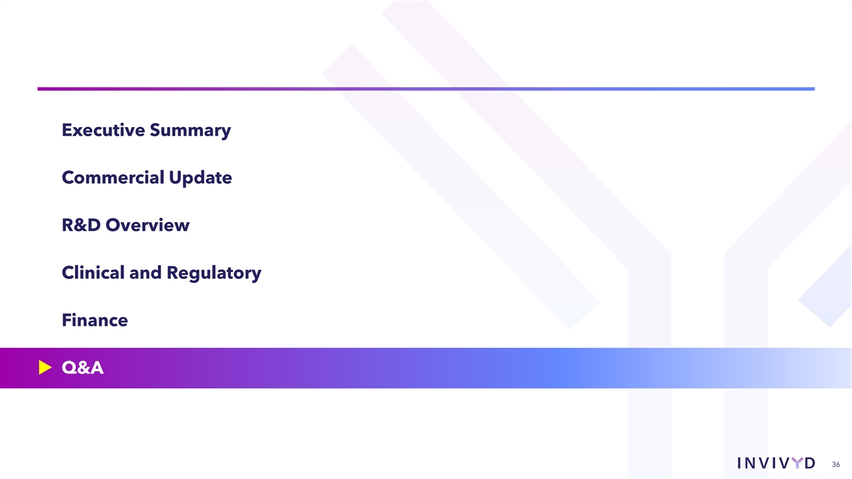 FINANCIALS • Q1 2025 PEMGARDA (pemivibart) net product revenue of $11.3 million • Continued execution of financial discipline and reduction of operating expenses – $27.4 million in Q1 2025 vs. $32.3 million in Q4 2024 • Ended Q1 2025 with approximately $48.1 million in cash and cash equivalents; potential financial flexibility with $30 million loan facility secured in April 2025 • Targeting near-term profitability (1H 2025) with existing cash and cash equivalents, anticipated growth of net product revenue, and continued reduction of operating expenses • Well-insulated from potential tariffs and most-favored-nation impact on PEMGARDA, with commercial supply located in U.S. and not commercialized outside of U.S. • Continuing to evaluate multiple sources of additional capital 35 Source: Invivyd Data on File