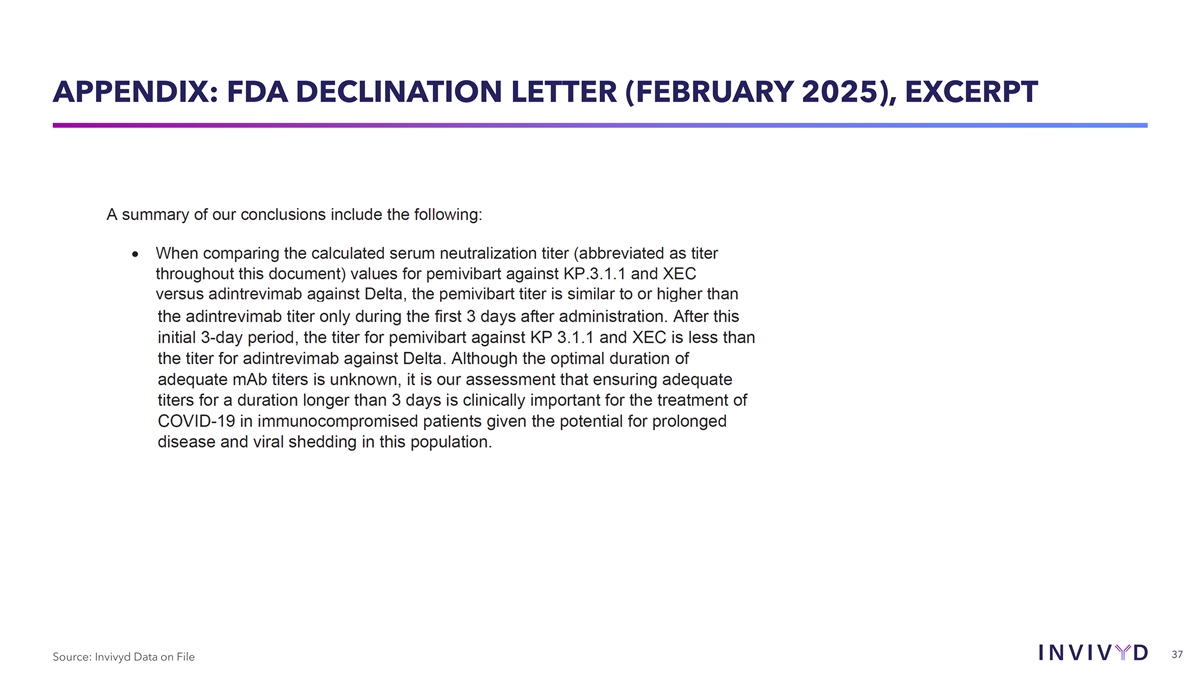 APPENDIX: FDA DECLINATION LETTER (FEBRUARY 2025), EXCERPT 37 Source: Invivyd Data on File