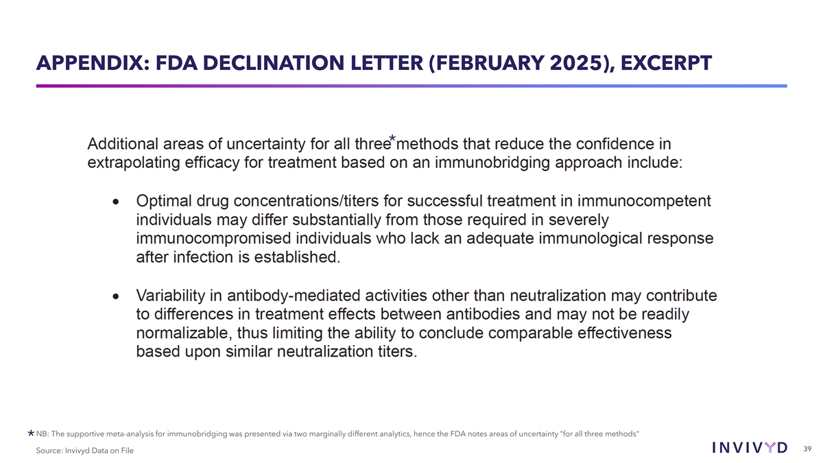 APPENDIX: FDA DECLINATION LETTER (FEBRUARY 2025), EXCERPT * NB: The supportive meta-analysis for immunobridging was presented via two marginally different analytics, hence the FDA notes areas of uncertainty for all three methods * 39 Source: Invivyd Data on File