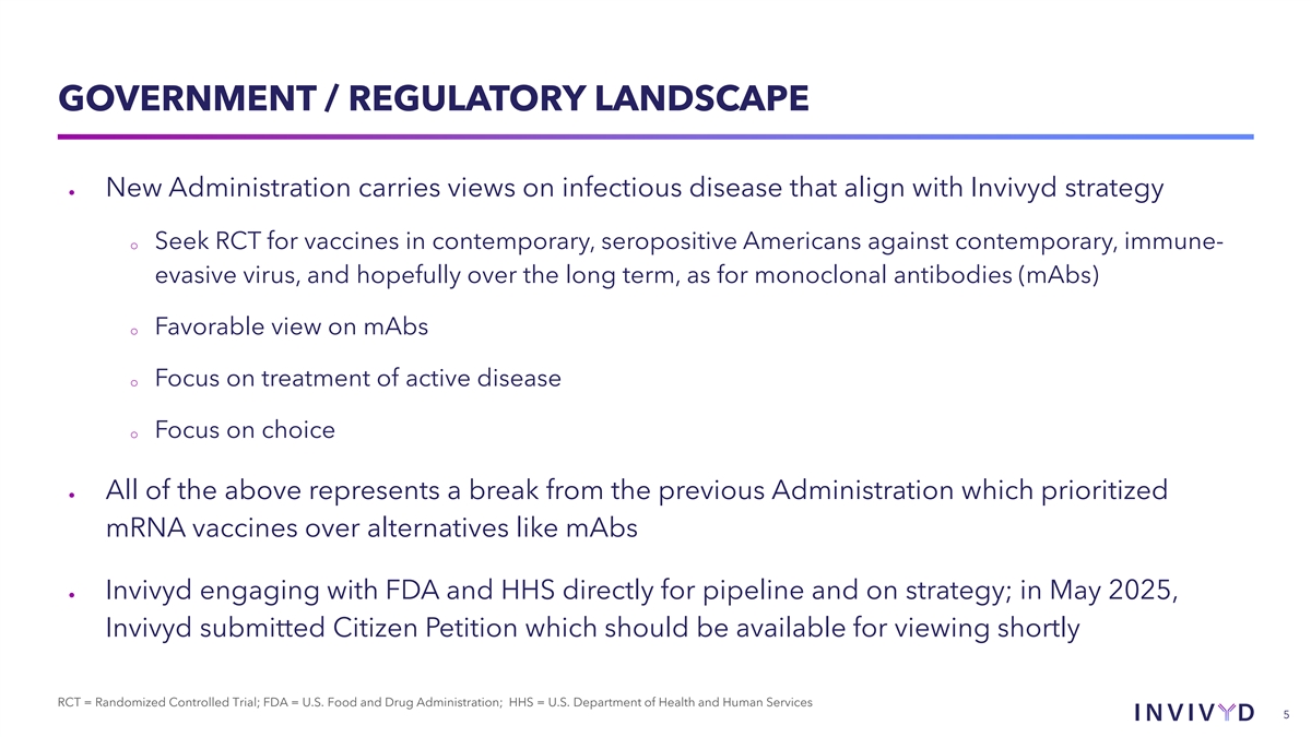 INVIVYD FOCUS: GROWTH AND EVOLUTION • Executed a commercial field force changeover with expected growth disruption during Q1 • Key commercial metrics in Q2 encouraging; focus remains on break-even and beyond • Pemivibart epitope has remained stable across now incalculable virus evolution post- Omicron – with no meaningful change to neutralization activity anticipated • Secured loan facility with SVB in April, allowing for potential access to $30 million in capital • COVID-19 pipeline emerging with VYD2311 positioned as a therapeutic and vaccine- alternative pending engagement with new FDA • Discovery program updates anticipated on RSV and measles later in 2025 SVB = Silicon Valley Bank, a division of First Citizens Bank; RSV = Respiratory Syncytial Virus 4