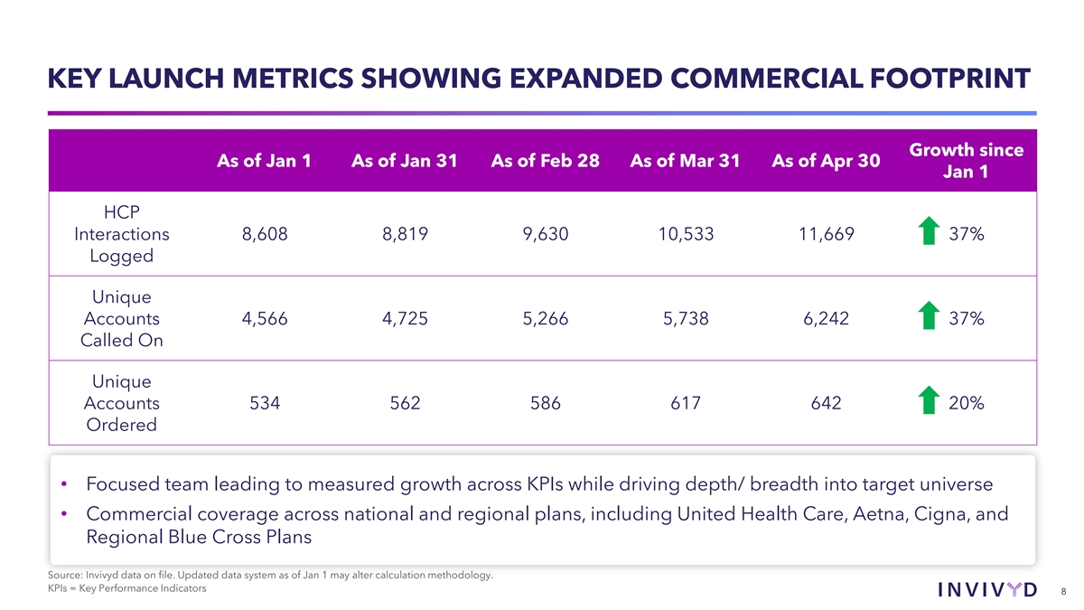 KEY LAUNCH METRICS SHOWING EXPANDED COMMERCIAL FOOTPRINT Growth since As of Jan 1 As of Jan 31 As of Feb 28 As of Mar 31 As of Apr 30 Jan 1 HCP Interactions 8,608 8,819 9,630 10,533 11,669 37% Logged Unique Accounts 4,566 4,725 5,266 5,738 6,242 37% Called On Unique Accounts 534 562 586 617 642 20% Ordered • Focused team leading to measured growth across KPIs while driving depth/ breadth into target universe • Commercial coverage across national and regional plans, including United Health Care, Aetna, Cigna, and Regional Blue Cross Plans Source: Invivyd data on file. Updated data system as of Jan 1 may alter calculation methodology. KPIs = Key Performance Indicators 8