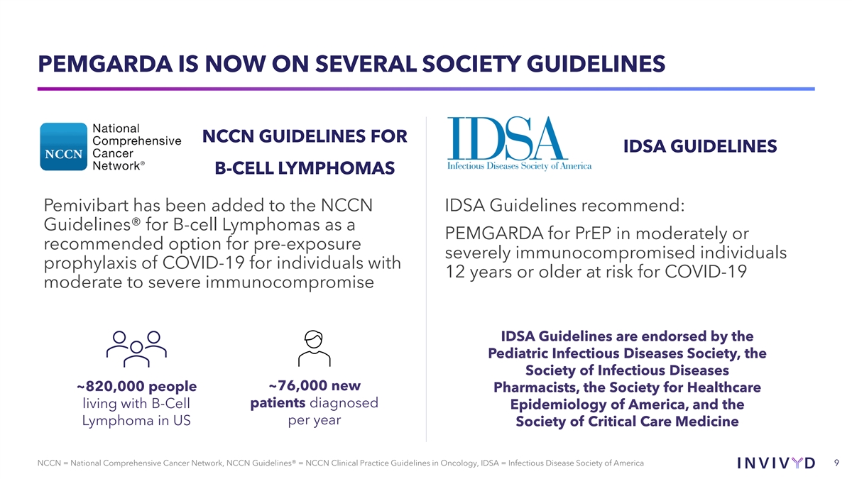 PEMGARDA IS NOW ON SEVERAL SOCIETY GUIDELINES NCCN GUIDELINES FOR IDSA GUIDELINES B-CELL LYMPHOMAS Pemivibart has been added to the NCCN IDSA Guidelines recommend: Guidelines® for B-cell Lymphomas as a PEMGARDA for PrEP in moderately or recommended option for pre-exposure severely immunocompromised individuals prophylaxis of COVID-19 for individuals with 12 years or older at risk for COVID-19 moderate to severe immunocompromise IDSA Guidelines are endorsed by the Pediatric Infectious Diseases Society, the Society of Infectious Diseases ~76,000 new ~820,000 people Pharmacists, the Society for Healthcare patients diagnosed living with B-Cell Epidemiology of America, and the Lymphoma in US per year Society of Critical Care Medicine NCCN = National Comprehensive Cancer Network, NCCN Guidelines® = NCCN Clinical Practice Guidelines in Oncology, IDSA = Infectious Disease Society of America 9