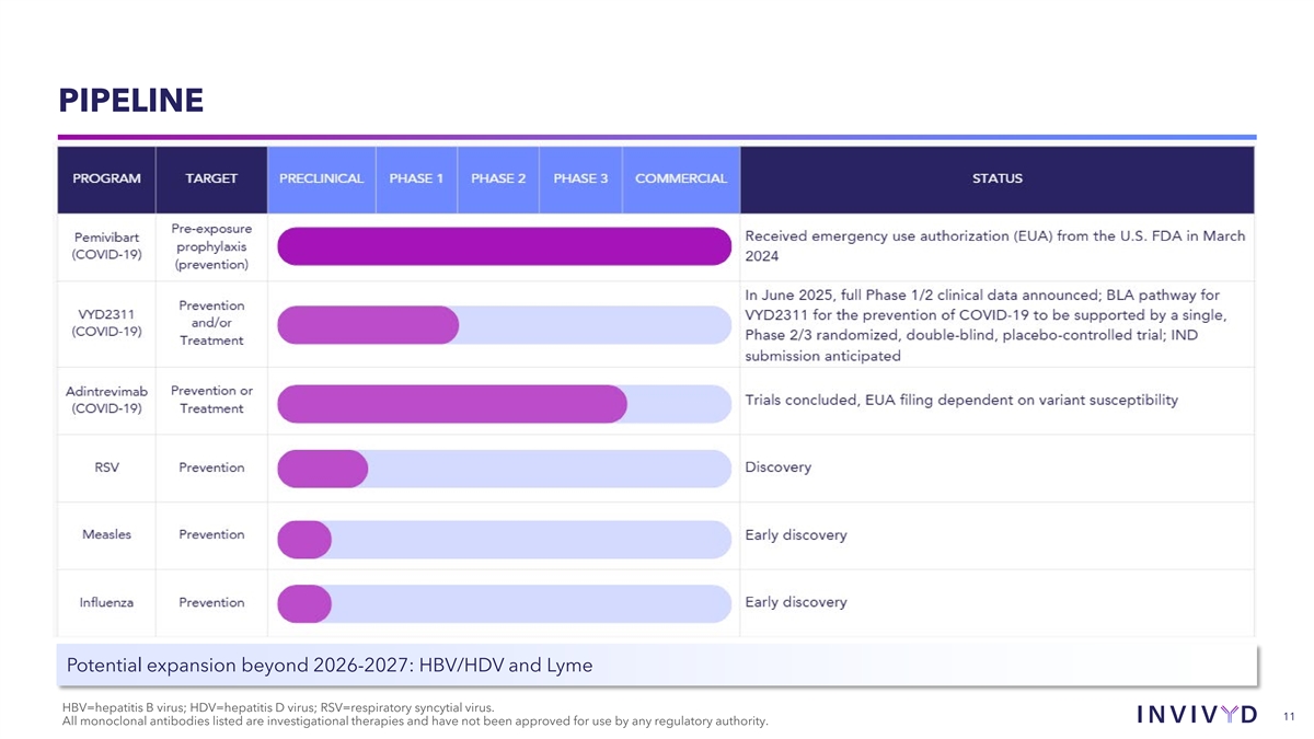 PIPELINE Potential expansion beyond 2026-2027: HBV/HDV and Lyme HBV=hepatitis B virus; HDV=hepatitis D virus; RSV=respiratory syncytial virus. 11 All monoclonal antibodies listed are investigational therapies and have not been approved for use by any regulatory authority.
