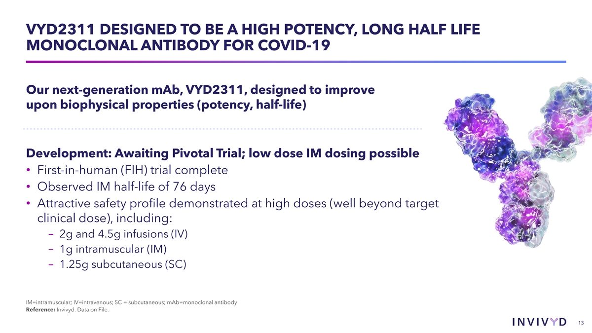 VYD2311 is a novel monoclonal antibody (mAb) candidate being developed for COVID-19 to continue to address the urgent need for new prophylactic and therapeutic options. The pharmacokinetic profile and antiviral potency of VYD2311 may offer the ability to deliver clinically meaningful titer levels through more patient-friendly means such as an intramuscular route of administration.