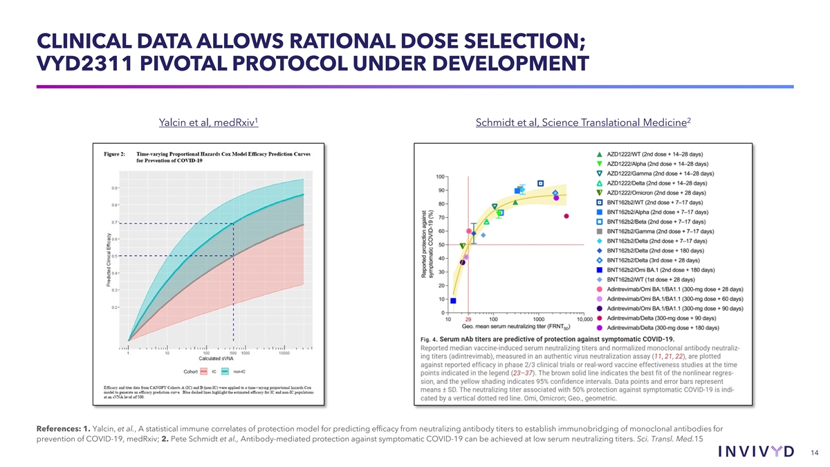 CLINICAL DATA ALLOWS RATIONAL DOSE SELECTION; VYD2311 PIVOTAL PROTOCOL UNDER DEVELOPMENT 1 2 Yalcin et al, medRxiv Schmidt et al, Science Translational Medicine References: 1. Yalcin, et al., A statistical immune correlates of protection model for predicting efficacy from neutralizing antibody titers to establish immunobridging of monoclonal antibodies for prevention of COVID-19, medRxiv; 2. Pete Schmidt et al., Antibody-mediated protection against symptomatic COVID-19 can be achieved at low serum neutralizing titers. Sci. Transl. Med.15 14 14