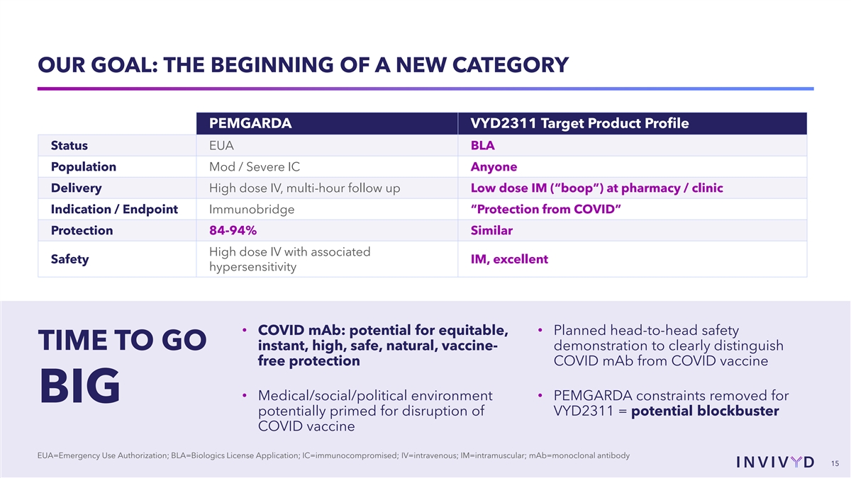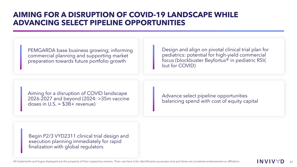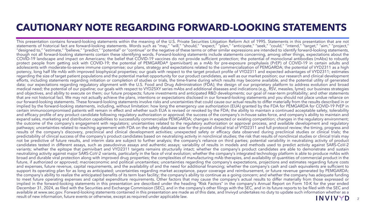 CAUTIONARY NOTE REGARDING FORWARD-LOOKING STATEMENTS This presentation contains forward-looking statements within the meaning of the U.S. Private Securities Litigation Reform Act of 1995. Statements in this presentation that are not statements of historical fact are forward-looking statements. Words such as “may,” “will,” “should,” “expect,” “plan,” “anticipate,” “seek,” “could,” “intend,” “target,” “aim,” “project,” “designed to,” “estimate,” “believe,” “predict,” “potential” or “continue” or the negative of these terms or other similar expressions are intended to identify forward-looking statements, though not all forward-looking statements contain these identifying words. Forward-looking statements include statements concerning, among other things, expectations about the COVID-19 landscape and impact on Americans; the belief that COVID-19 vaccines do not provide sufficient protection; the potential of monoclonal antibodies (mAbs) to robustly protect people from getting sick with COVID-19; the potential of PEMGARDA® (pemivibart) as a mAb for pre-exposure prophylaxis (PrEP) of COVID-19 in certain adults and adolescents with moderate-to-severe immune compromise; our plans, strategy and expectations related to the commercialization of PEMGARDA; the potential of VYD2311 as a high potency, long half life mAb with improved biophysical properties; our goals with respect to the target product profile of VYD2311 and expected advantages of VYD2311; estimates regarding the size of target patient populations and the potential market opportunity for our product candidates, as well as our market position; our research and clinical development efforts, including statements regarding initiation or completion of studies or trials, the time-frame during which results may become available, and the potential utility of generated data; our expectations regarding regulatory alignment with the U.S. Food and Drug Administration (FDA); the design of our proprietary platform to address evolution and broad medical need; the potential of our pipeline; our goals with respect to VYD25XY series mAbs and additional diseases and indications (e.g., RSV, measles, lyme); our business strategies and objectives, and ability to execute on them; our future prospects; future investments and anticipated R&D developments; our goal of near-term profitability; and other statements that are not historical fact. We may not actually achieve the plans, intentions or expectations disclosed in our forward-looking statements and you should not place undue reliance on our forward-looking statements. These forward-looking statements involve risks and uncertainties that could cause our actual results to differ materially from the results described in or implied by the forward-looking statements, including, without limitation: how long the emergency use authorization (EUA) granted by the FDA for PEMGARDA for COVID-19 PrEP in certain immunocompromised patients will remain in effect and whether such EUA is revised or revoked by the FDA; the ability to maintain a continued acceptable safety, tolerability and efficacy profile of any product candidate following regulatory authorization or approval; the success of the company’s in-house sales force, and company’s ability to maintain and expand sales, marketing and distribution capabilities to successfully commercialize PEMGARDA; changes in expected or existing competition; changes in the regulatory environment; the outcome of the company’s engagement with regulators; uncertainties related to the regulatory authorization or approval process, and available development and regulatory pathways; uncertainties related to reaching agreement with FDA on the safety database size for the pivotal clinical trial of VYD2311 and full protocol review; the timing, progress and results of the company’s discovery, preclinical and clinical development activities; unexpected safety or efficacy data observed during preclinical studies or clinical trials; the predictability of clinical success of the company’s product candidates based on neutralizing activity in nonclinical studies; the risk that results of nonclinical studies or clinical trials may not be predictive of future results, and interim data are subject to further analysis; the company’s reliance on third parties; potential variability in neutralizing activity of product candidates tested in different assays, such as pseudovirus assays and authentic assays; variability of results in models and methods used to predict activity against SARS-CoV-2 variants; whether the epitope that pemivibart and VYD2311 targets remains structurally intact; whether the company’s product candidates are able to demonstrate and sustain neutralizing activity against major SARS-CoV-2 variants, particularly in the face of viral evolution; whether the company’s integrated technology platform is able to produce mAbs with broad and durable viral protection along with improved drug properties; the complexities of manufacturing mAb therapies, and availability of quantities of commercial product in the future, if authorized or approved; macroeconomic and political uncertainties; uncertainties regarding the company’s expectations, projections and estimates regarding future costs and expenses, future revenue, capital requirements, and the availability of and the need for additional financing; whether the company’s cash and cash equivalents are sufficient to support its operating plan for as long as anticipated; uncertainties regarding market acceptance, payor coverage and reimbursement, or future revenue generated by PEMGARDA; the company’s ability to realize the anticipated benefits of its term loan facility; the company’s ability to continue as a going concern; and whether the company has adequate funding to meet future operating expenses and capital expenditure requirements. Other factors tha