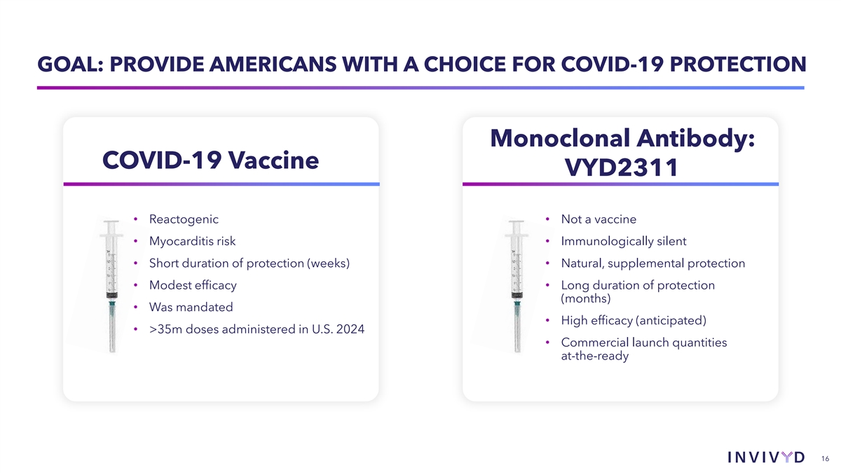 OUR GOAL: THE BEGINNING OF A NEW CATEGORY PEMGARDA VYD2311 Target Product Profile Status EUA BLA Population Mod / Severe IC Anyone Delivery High dose IV, multi-hour follow up Low dose IM (“boop”) at pharmacy / clinic Indication / Endpoint Immunobridge “Protection from COVID” Protection 84-94% Similar High dose IV with associated Safety IM, excellent hypersensitivity • COVID mAb: potential for equitable, • Planned head-to-head safety TIME TO GO instant, high, safe, natural, vaccine- demonstration to clearly distinguish free protection COVID mAb from COVID vaccine • Medical/social/political environment • PEMGARDA constraints removed for BIG potentially primed for disruption of VYD2311 = potential blockbuster COVID vaccine EUA=Emergency Use Authorization; BLA=Biologics License Application; IC=immunocompromised; IV=intravenous; IM=intramuscular; mAb=monoclonal antibody 15