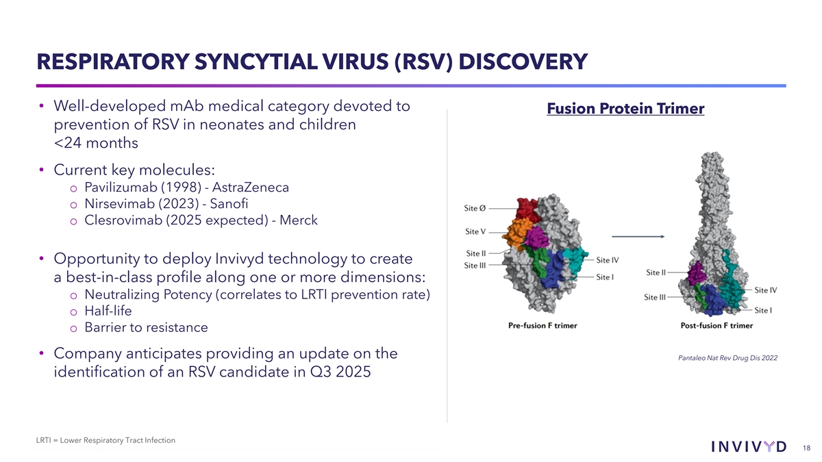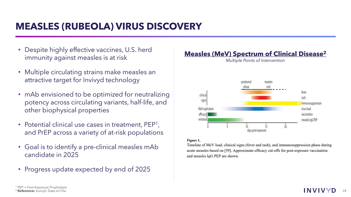 RESPIRATORY SYNCYTIAL VIRUS (RSV) DISCOVERY • Well-developed mAb medical category devoted to Fusion Protein Trimer prevention of RSV in neonates and children <24 months • Current key molecules: o Pavilizumab (1998) - AstraZeneca o Nirsevimab (2023) - Sanofi o Clesrovimab (2025 expected) - Merck • Opportunity to deploy Invivyd technology to create a best-in-class profile along one or more dimensions: o Neutralizing Potency (correlates to LRTI prevention rate) o Half-life o Barrier to resistance • Company anticipates providing an update on the Pantaleo Nat Rev Drug Dis 2022 identification of an RSV candidate in Q3 2025 LRTI = Lower Respiratory Tract Infection 18