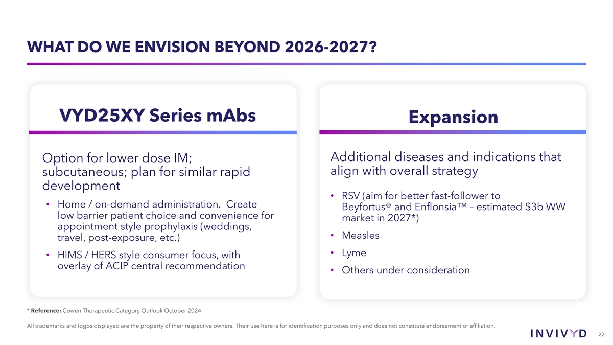 AIMING FOR A DISRUPTION OF COVID-19 LANDSCAPE WHILE ADVANCING SELECT PIPELINE OPPORTUNITIES Design and align on pivotal clinical trial plan for PEMGARDA base business growing; informing pediatrics: potential for high-yield commercial commercial planning and supporting market focus (blockbuster Beyfortus® in pediatric RSV, preparation towards future portfolio growth but for COVID) Aiming for a disruption of COVID landscape Advance select pipeline opportunities 2026-2027 and beyond (2024: >35m vaccine balancing spend with cost of equity capital doses in U.S. = $3B+ revenue) Begin P2/3 VYD2311 clinical trial design and execution planning immediately for rapid finalization with global regulators All trademarks and logos displayed are the property of their respective owners. Their use here is for identification purposes only and does not constitute endorsement or affiliation. 21
