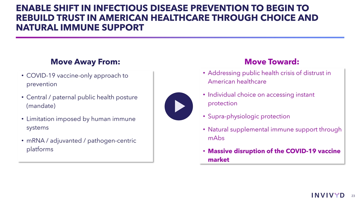 ENABLE SHIFT IN INFECTIOUS DISEASE PREVENTION TO BEGIN TO REBUILD TRUST IN AMERICAN HEALTHCARE THROUGH CHOICE AND NATURAL IMMUNE SUPPORT Move Away From: Move Toward: • Addressing public health crisis of distrust in • COVID-19 vaccine-only approach to American healthcare prevention • Individual choice on accessing instant • Central / paternal public health posture protection (mandate) • Supra-physiologic protection • Limitation imposed by human immune systems • Natural supplemental immune support through mAbs • mRNA / adjuvanted / pathogen-centric platforms • Massive disruption of the COVID-19 vaccine market 23