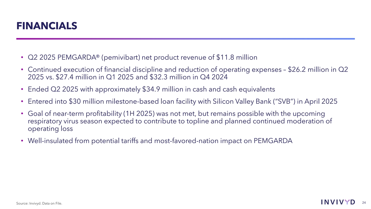 FINANCIALS • Q2 2025 PEMGARDA® (pemivibart) net product revenue of $11.8 million • Continued execution of financial discipline and reduction of operating expenses – $26.2 million in Q2 2025 vs. $27.4 million in Q1 2025 and $32.3 million in Q4 2024 • Ended Q2 2025 with approximately $34.9 million in cash and cash equivalents • Entered into $30 million milestone-based loan facility with Silicon Valley Bank (“SVB”) in April 2025 • Goal of near-term profitability (1H 2025) was not met, but remains possible with the upcoming respiratory virus season expected to contribute to topline and planned continued moderation of operating loss • Well-insulated from potential tariffs and most-favored-nation impact on PEMGARDA 24 Source: Invivyd. Data on File.