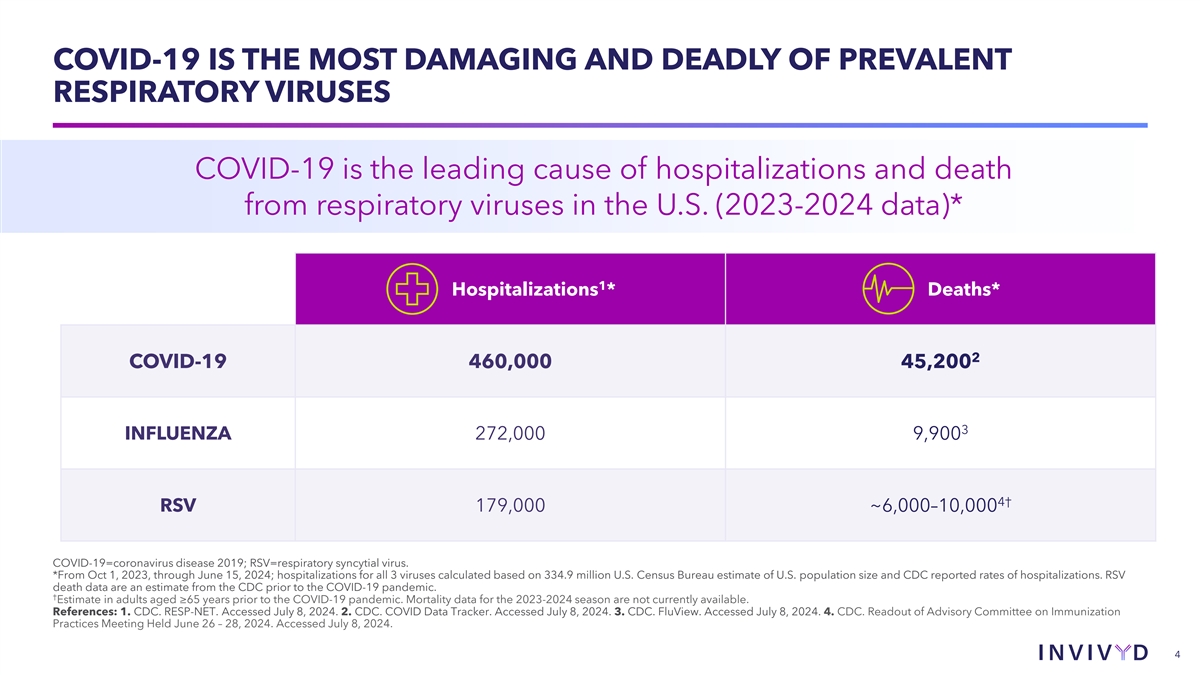 COVID-19 IS THE MOST DAMAGING AND DEADLY OF PREVALENT RESPIRATORY VIRUSES COVID-19 is the leading cause of hospitalizations and death from respiratory viruses in the U.S. (2023-2024 data)* 1 Hospitalizations * Deaths* 2 COVID-19 460,000 45,200 3 INFLUENZA 272,000 9,900 4† RSV 179,000 ~6,000–10,000 COVID-19=coronavirus disease 2019; RSV=respiratory syncytial virus. *From Oct 1, 2023, through June 15, 2024; hospitalizations for all 3 viruses calculated based on 334.9 million U.S. Census Bureau estimate of U.S. population size and CDC reported rates of hospitalizations. RSV death data are an estimate from the CDC prior to the COVID-19 pandemic. † Estimate in adults aged ≥65 years prior to the COVID-19 pandemic. Mortality data for the 2023-2024 season are not currently available. References: 1. CDC. RESP-NET. Accessed July 8, 2024. 2. CDC. COVID Data Tracker. Accessed July 8, 2024. 3. CDC. FluView. Accessed July 8, 2024. 4. CDC. Readout of Advisory Committee on Immunization Practices Meeting Held June 26 – 28, 2024. Accessed July 8, 2024. 4