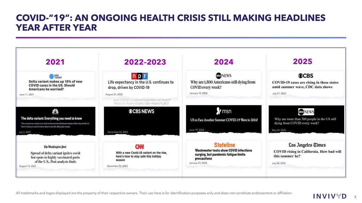 COVID-”19”: AN ONGOING HEALTH CRISIS STILL MAKING HEADLINES YEAR AFTER YEAR 2025 2021 2022–2023 2024 COVID-19 cases are rising in these states amid summer wave, CDC data shows January 10, 2024 July 21, 2025 July 2, 2021 August 31, 2022 June 11, 2021 Why are more than 300 people in the US still dying from COVID every week? June 19, 2024 May 24, 2025 December 22, 2023 July 2, 2021 COVID rising in California. How bad will this summer be? January 23, 2024 July 28, 2025 August 12, 2021 December 22, 2023 All trademarks and logos displayed are the property of their respective owners. Their use here is for identification purposes only and does not constitute endorsement or affiliation. 5