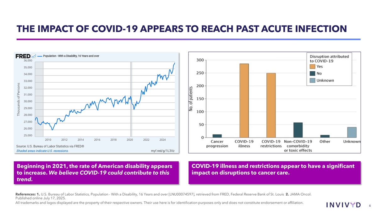 THE IMPACT OF COVID-19 APPEARS TO REACH PAST ACUTE INFECTION Beginning in 2021, the rate of American disability appears COVID-19 illness and restrictions appear to have a significant to increase. We believe COVID-19 could contribute to this impact on disruptions to cancer care. trend. References: 1. U.S. Bureau of Labor Statistics, Population - With a Disability, 16 Years and over [LNU00074597], retrieved from FRED, Federal Reserve Bank of St. Louis 2. JAMA Oncol. Published online July 17, 2025. All trademarks and logos displayed are the property of their respective owners. Their use here is for identification purposes only and does not constitute endorsement or affiliation. 6