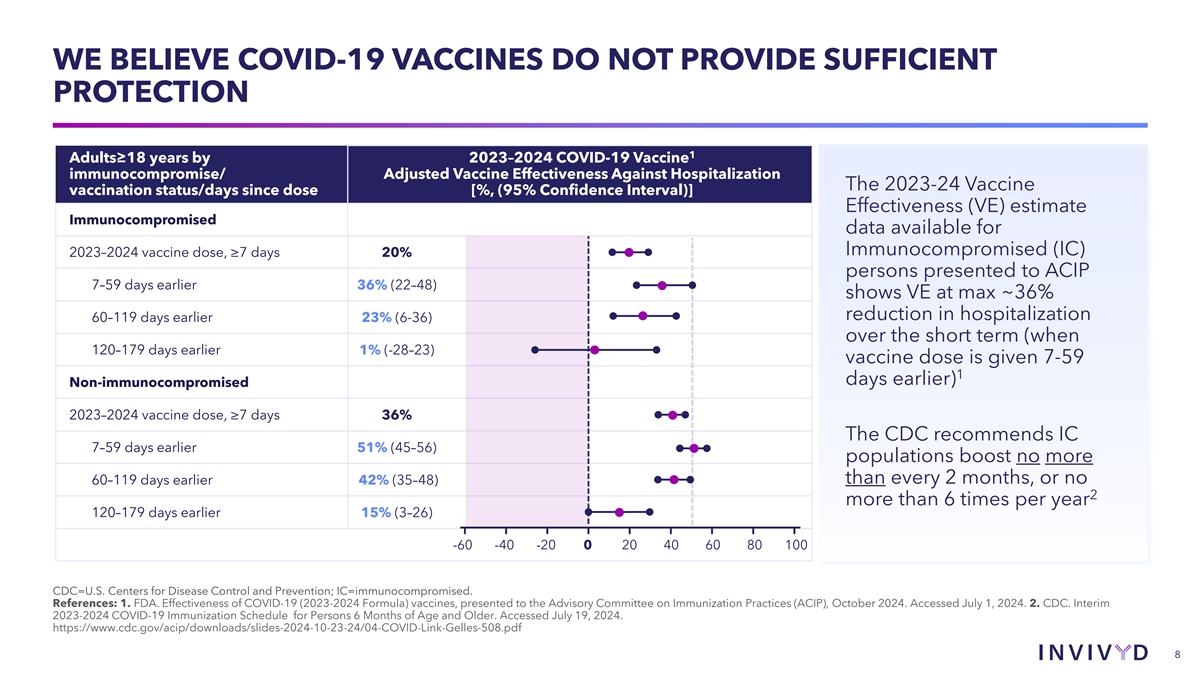 WE BELIEVE COVID-19 VACCINES DO NOT PROVIDE SUFFICIENT PROTECTION 1 Adults≥18 years by 2023–2024 COVID-19 Vaccine immunocompromise/ Adjusted Vaccine Effectiveness Against Hospitalization The 2023-24 Vaccine vaccination status/days since dose [%, (95% Confidence Interval)] Effectiveness (VE) estimate Immunocompromised data available for Immunocompromised (IC) 2023–2024 vaccine dose, ≥7 days 20% persons presented to ACIP 7–59 days earlier 36% (22–48) shows VE at max ~36% reduction in hospitalization 60–119 days earlier 23% (6-36) over the short term (when 120–179 days earlier 1% (-28–23) vaccine dose is given 7-59 1 days earlier) Non-immunocompromised 2023–2024 vaccine dose, ≥7 days 36% The CDC recommends IC 7–59 days earlier 51% (45–56) populations boost no more than every 2 months, or no 60–119 days earlier 42% (35–48) 2 more than 6 times per year 120–179 days earlier 15% (3–26) -60 -40 -20 0 20 40 60 80 100 CDC=U.S. Centers for Disease Control and Prevention; IC=immunocompromised. References: 1. FDA. Effectiveness of COVID-19 (2023-2024 Formula) vaccines, presented to the Advisory Committee on Immunization Practices (ACIP), October 2024. Accessed July 1, 2024. 2. CDC. Interim 2023-2024 COVID-19 Immunization Schedule for Persons 6 Months of Age and Older. Accessed July 19, 2024. https://www.cdc.gov/acip/downloads/slides-2024-10-23-24/04-COVID-Link-Gelles-508.pdf 8